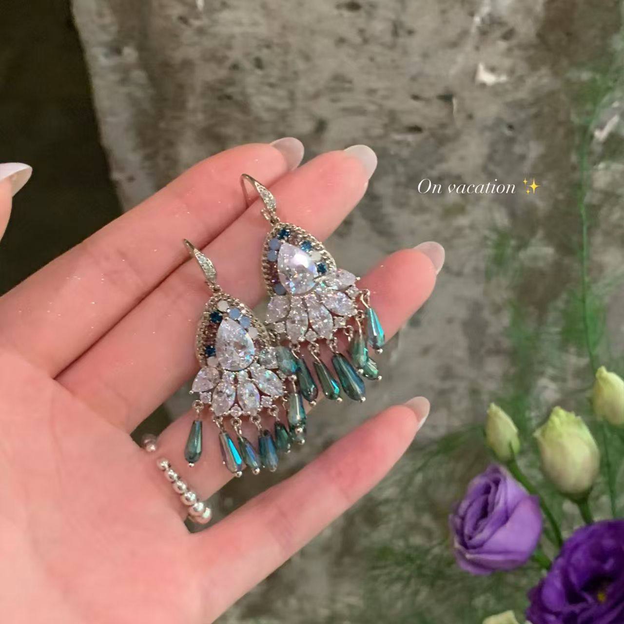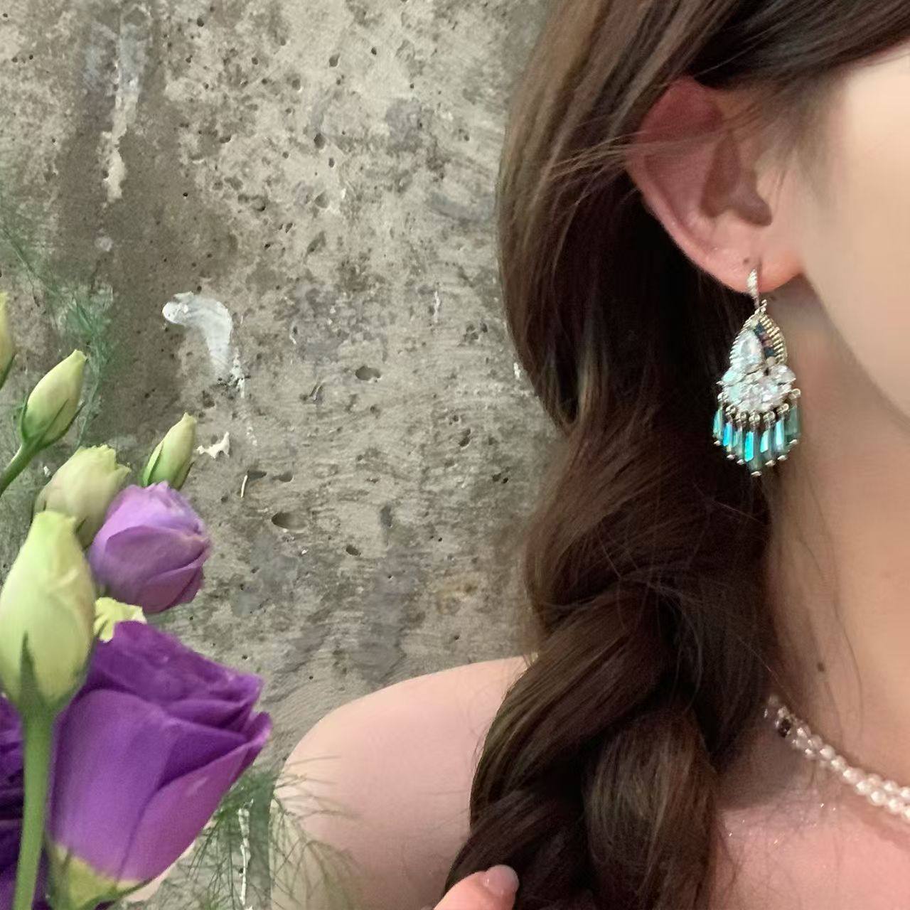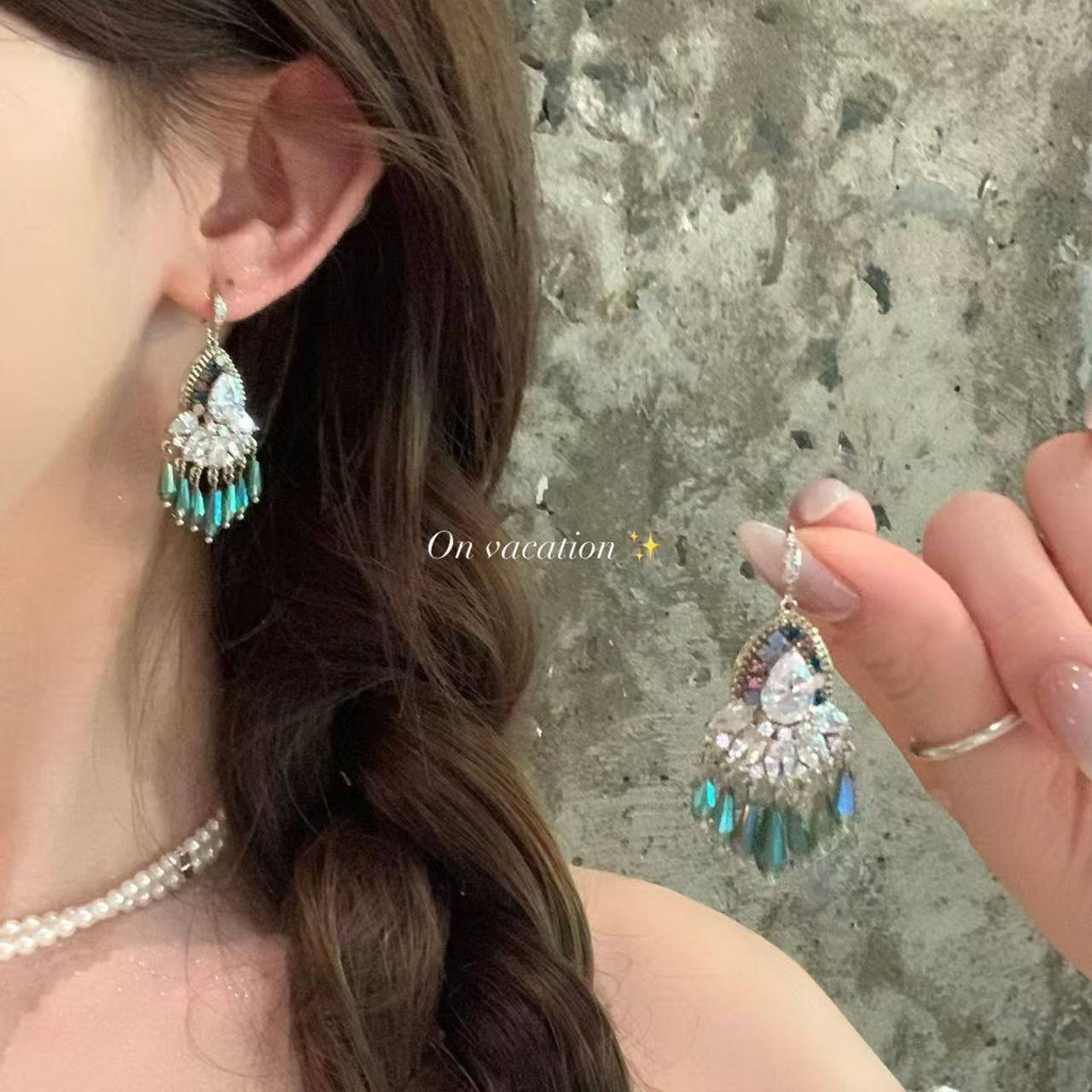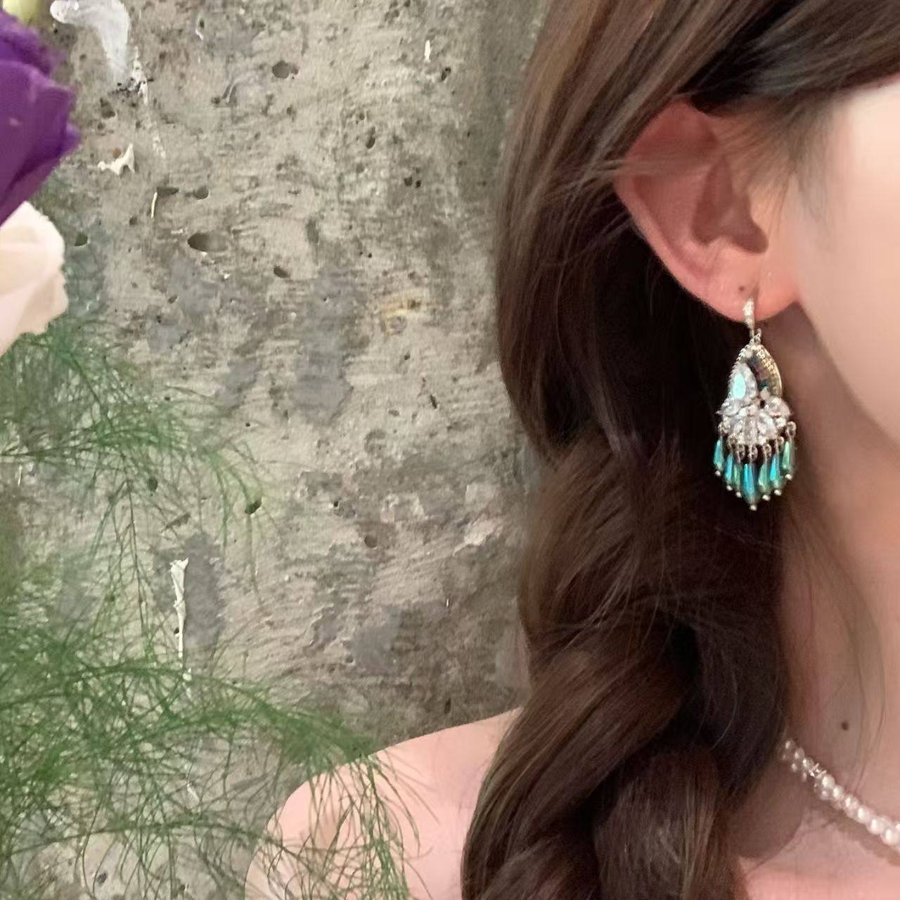 复古民族风湖蓝色水滴流苏耳环女夏海边度假风耳钉波西米亚耳饰
