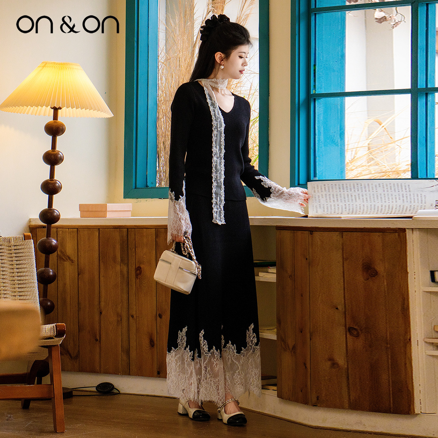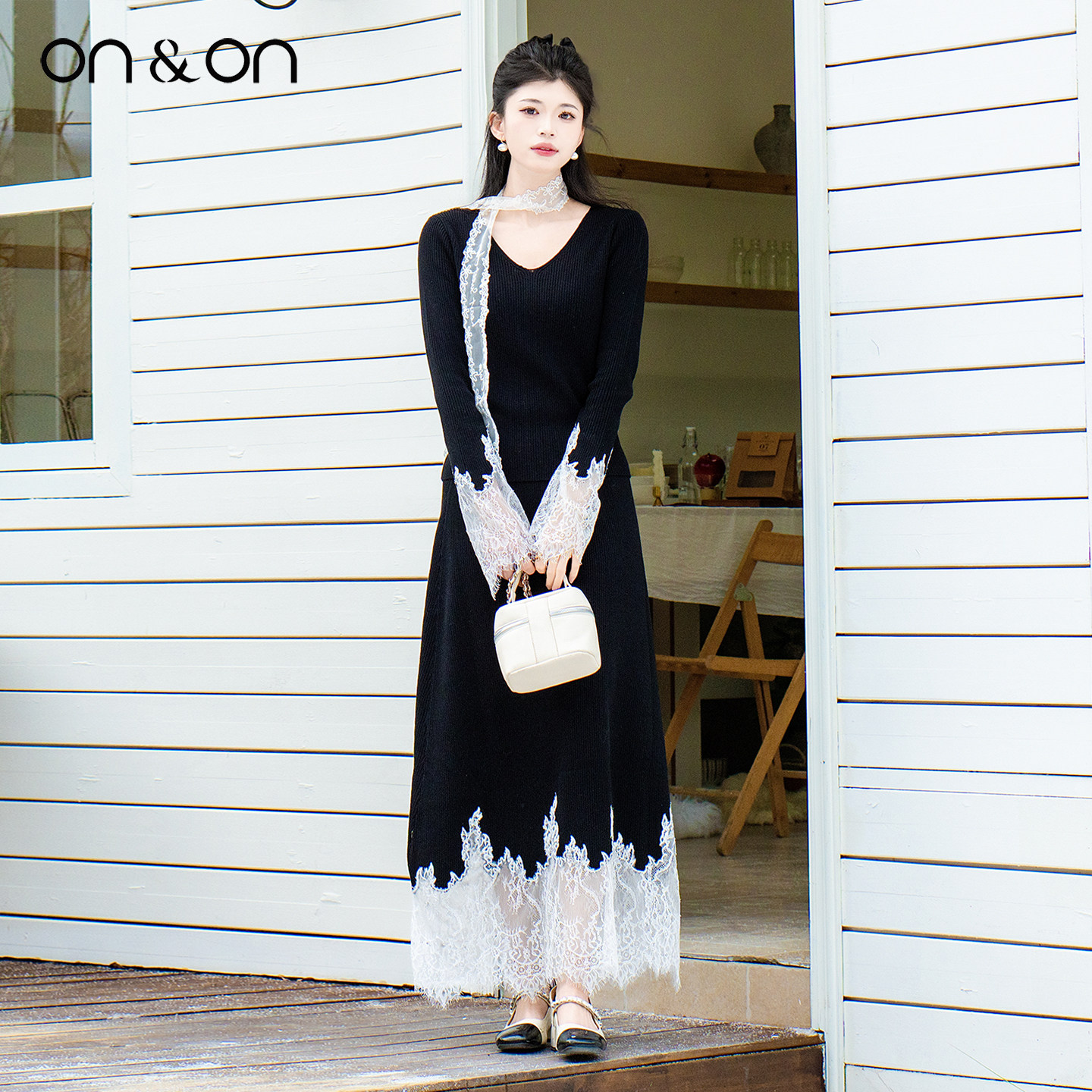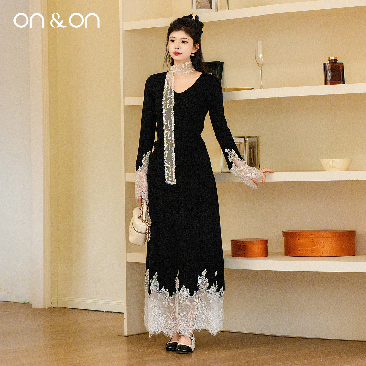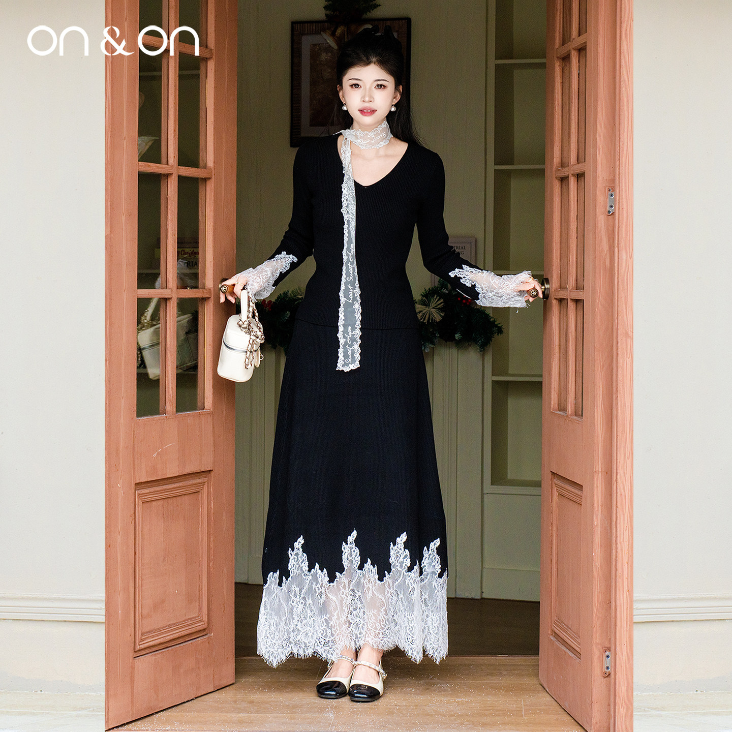 ON&ON/安乃安2025冬季新款韩系气质轻奢弹力蕾丝拼接针织套装裙