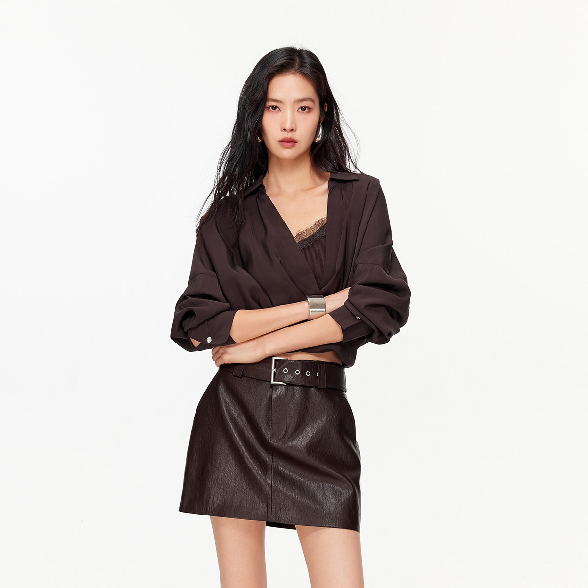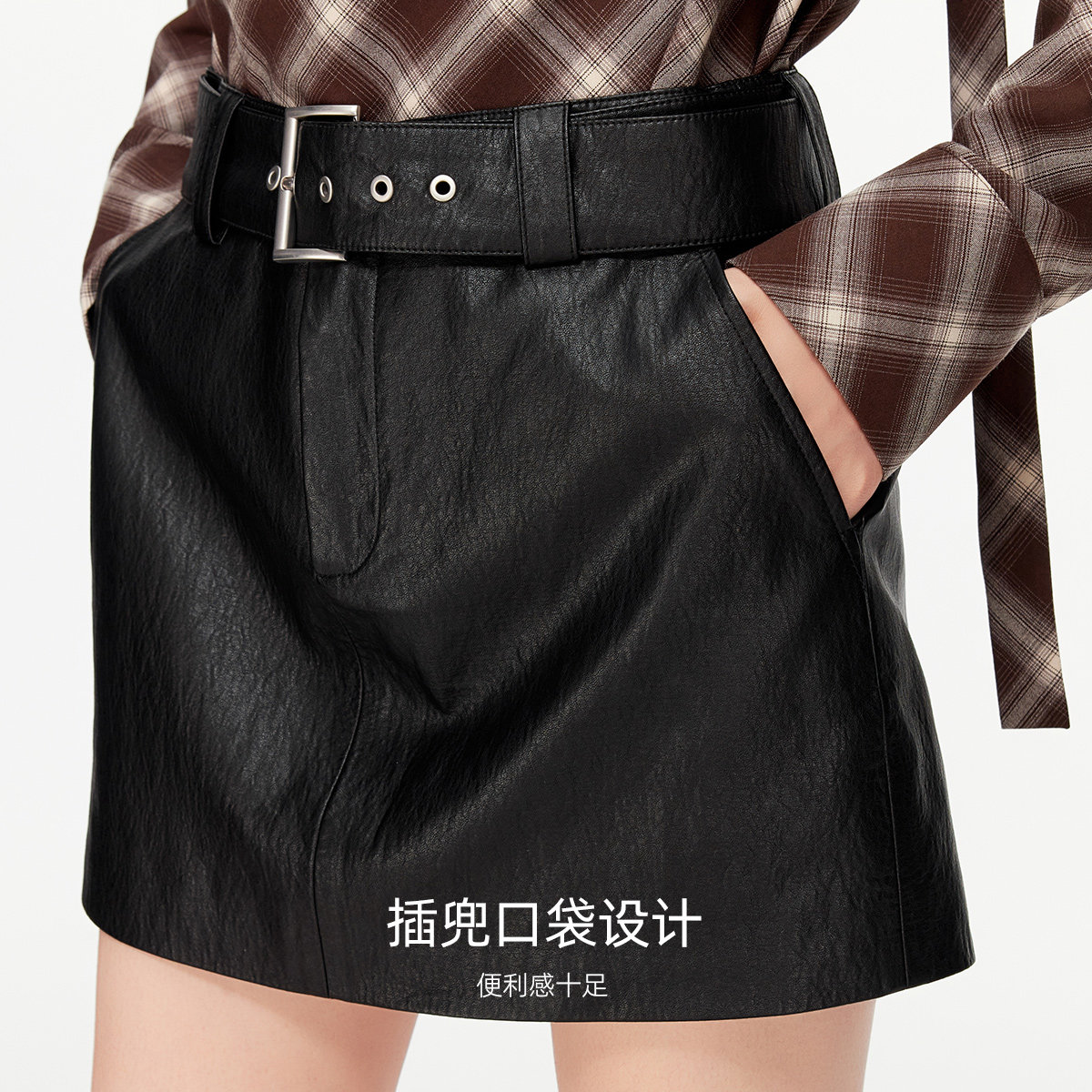 PU短裙,经典时髦;可拆腰带,摩登女人味