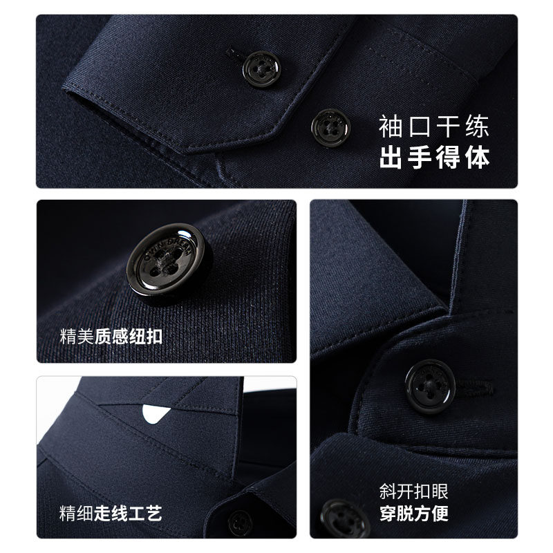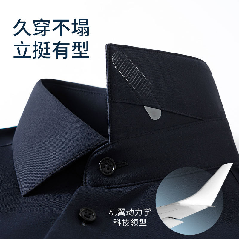 欧定头等舱高弹长袖衬衫男新款深蓝宝石纯色免烫修身商务休闲衬衣