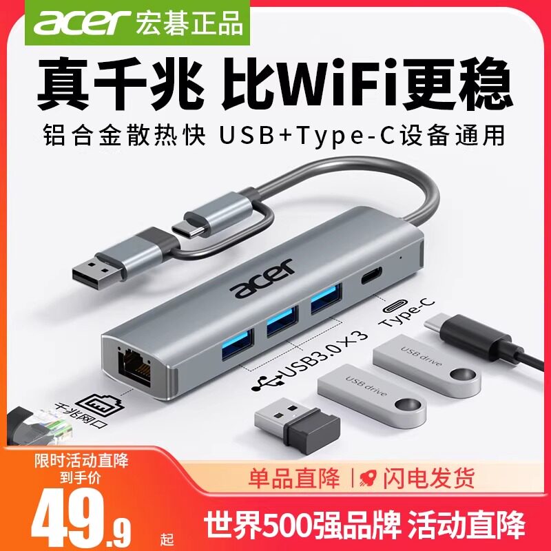 Acer/宏碁扩展坞typec千兆网线转接口usb分线器3.0高速hub集线器网口转换器笔记本电脑台式机多接口拓展坞