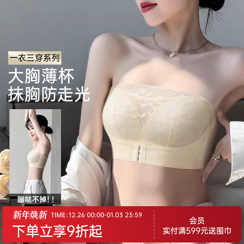 润微无肩带半杯内衣女大胸显小显瘦防滑蕾丝抹胸薄款文胸美背舒适