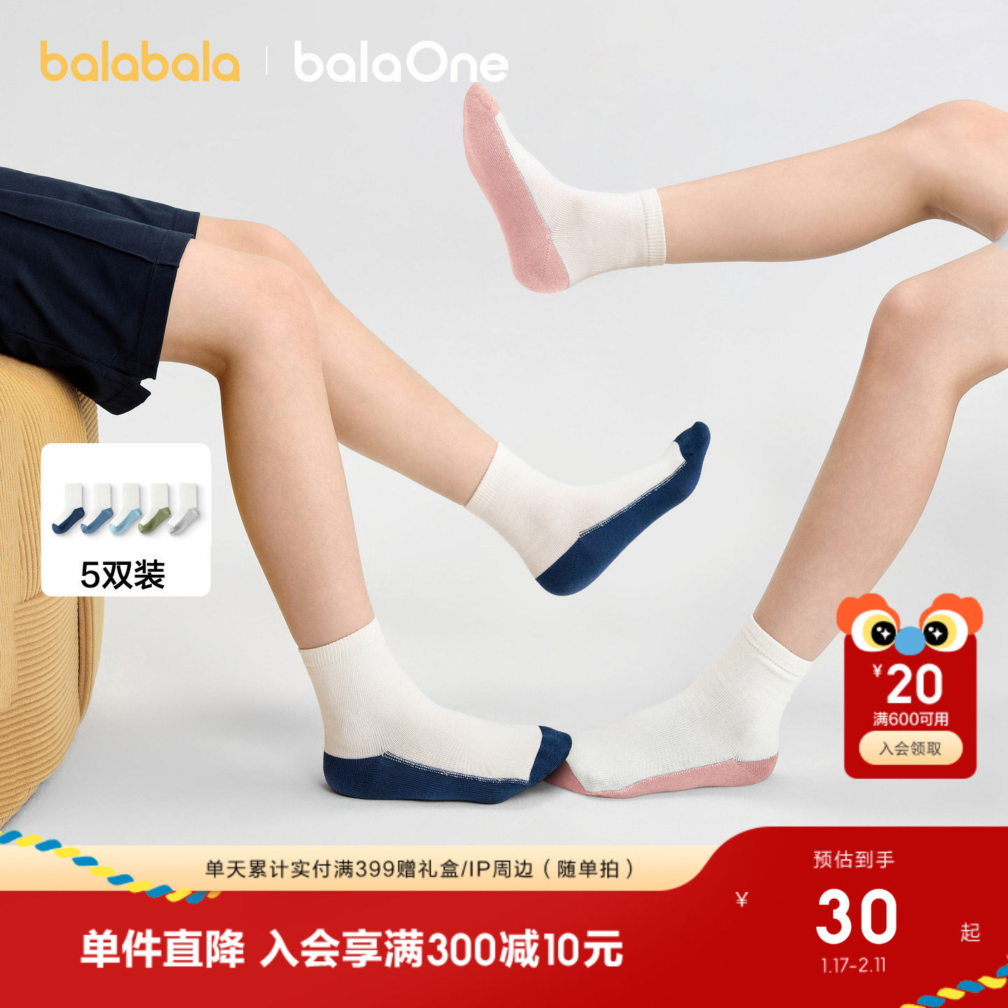 巴拉巴拉儿童袜子春秋男童女童棉袜儿童宝宝中大童学生打底五双装
