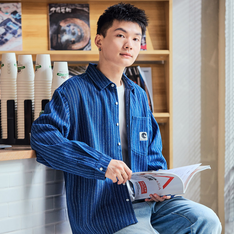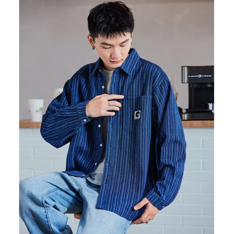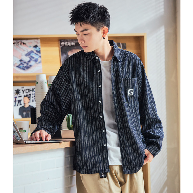 唐狮春秋新款男士翻领长袖牛仔衬衫条纹工装外套复古港风休闲潮TE