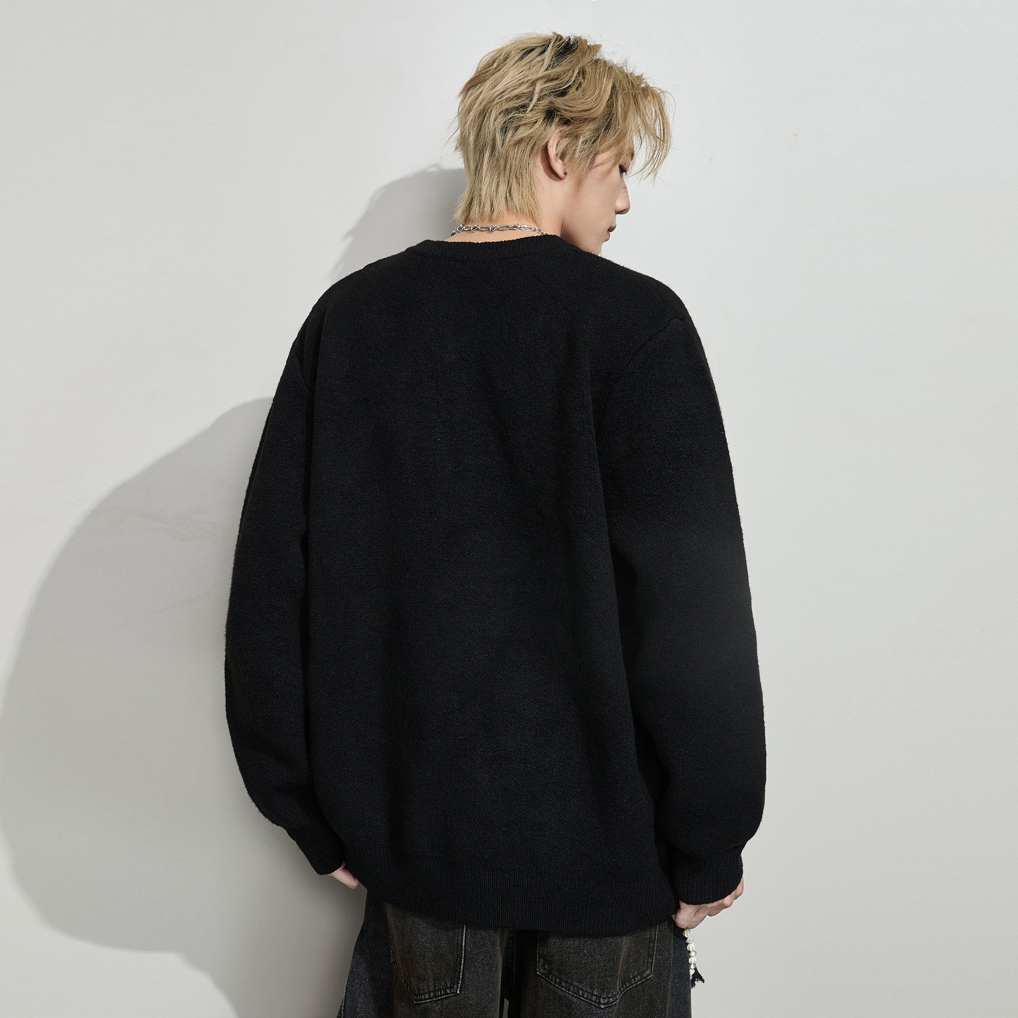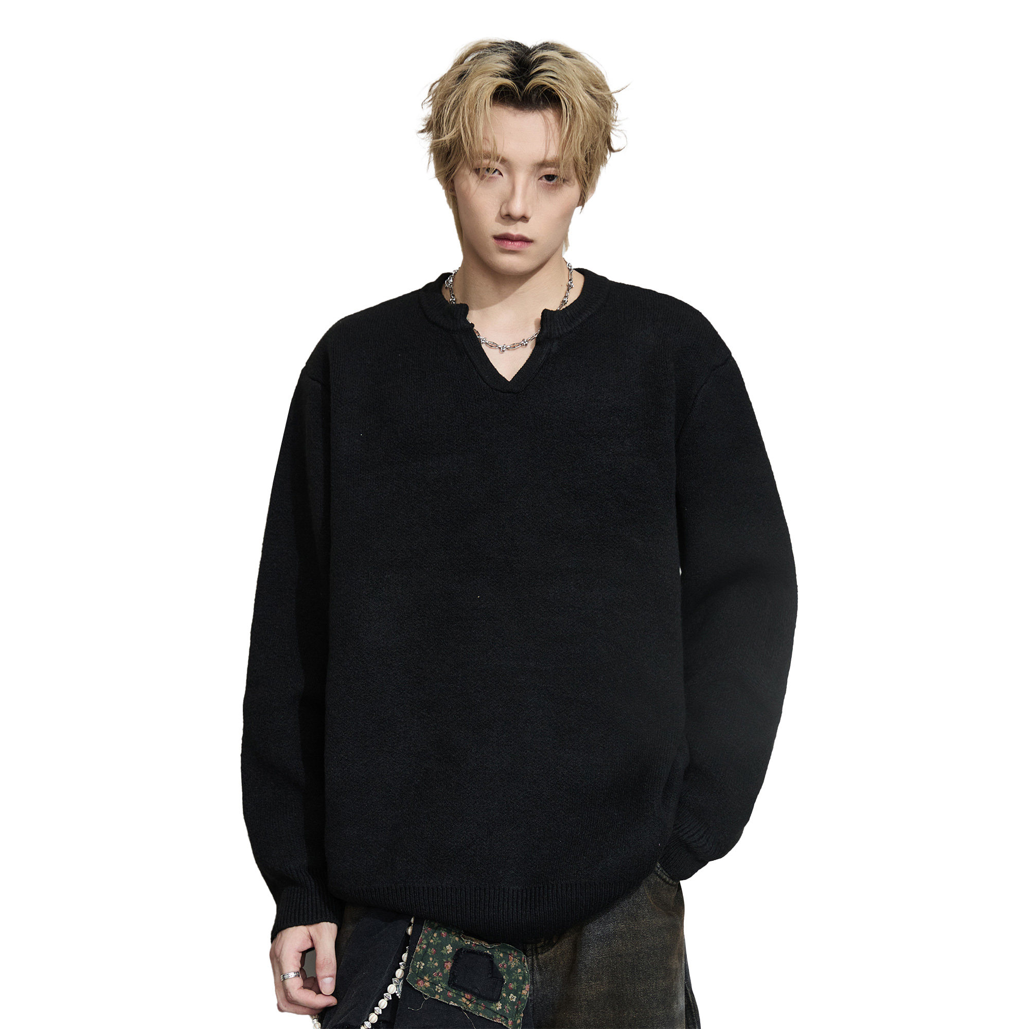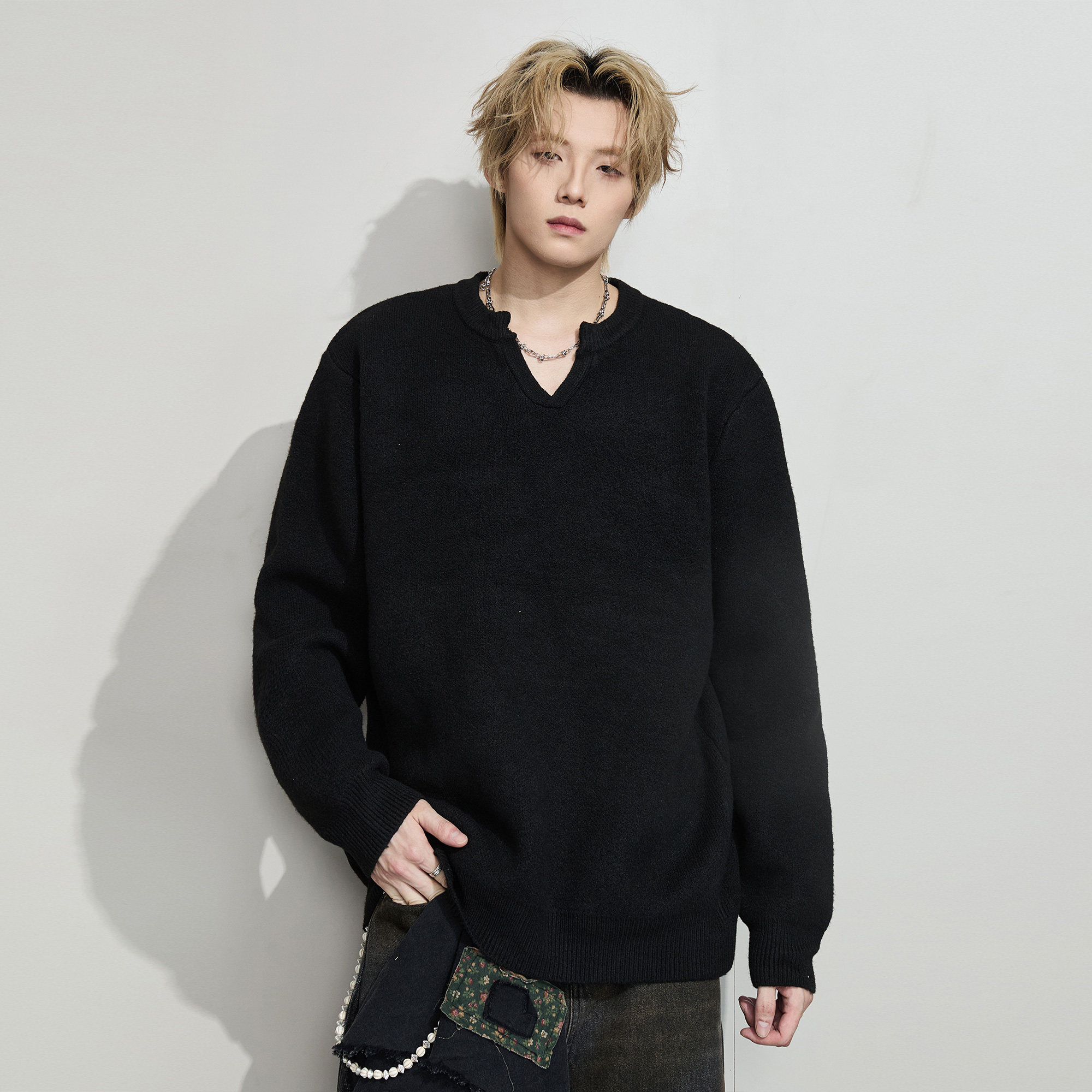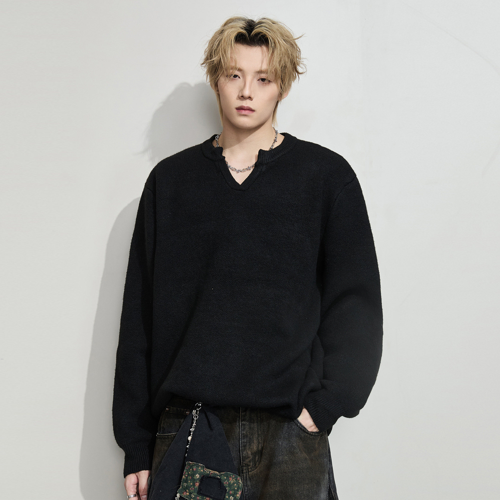 ALLIN 美式黑色V领毛衣男秋冬潮牌慵懒风百搭针织衫情侣休闲外套