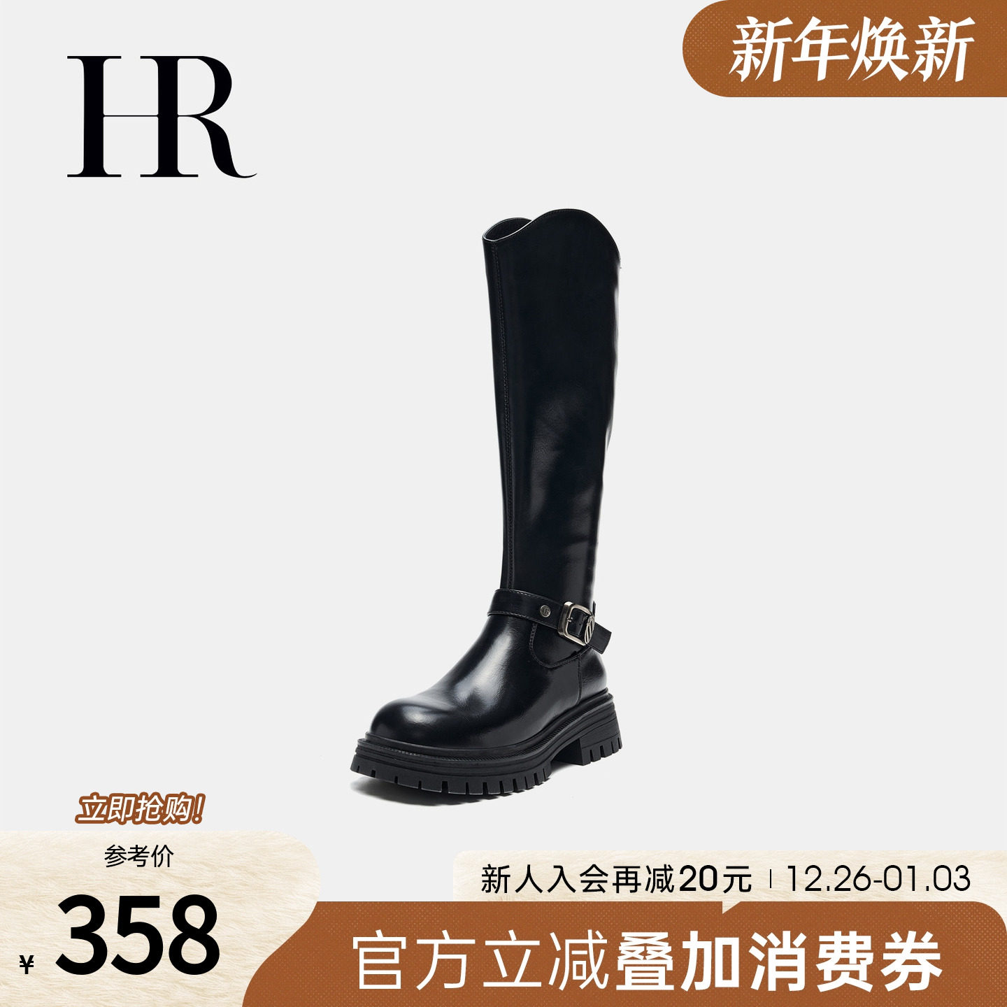 HR赫莲娜女鞋子2025冬季新款骑士靴水晶绒皮带扣复古长靴显瘦增高