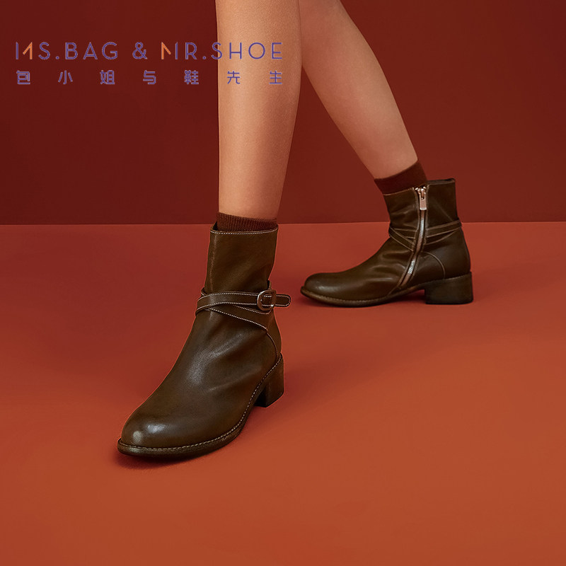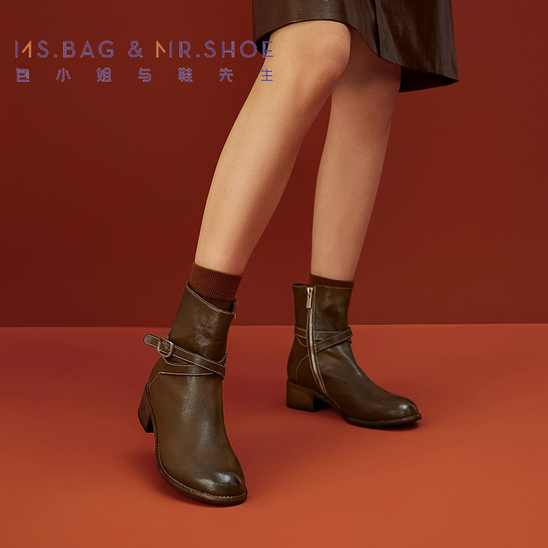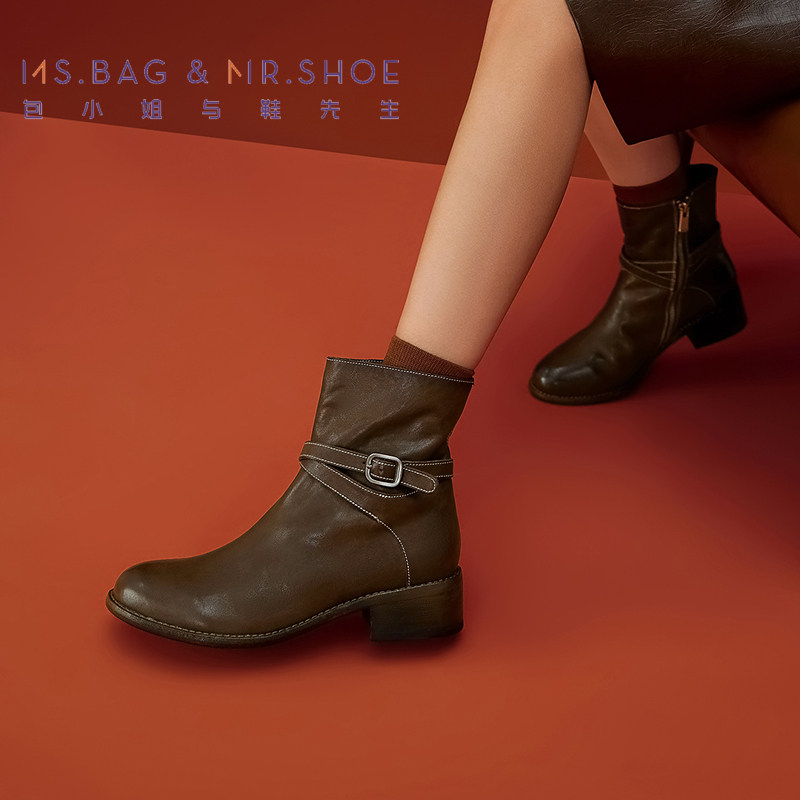 包小姐与鞋先生秋冬卡其水洗马皮低跟西部短靴女244199