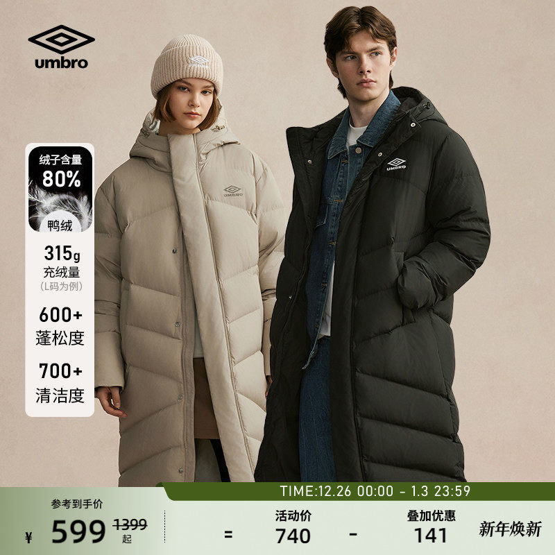 umbro茵宝运动足球连帽中长款羽绒服鸭绒户外冬季保暖加厚情侣款