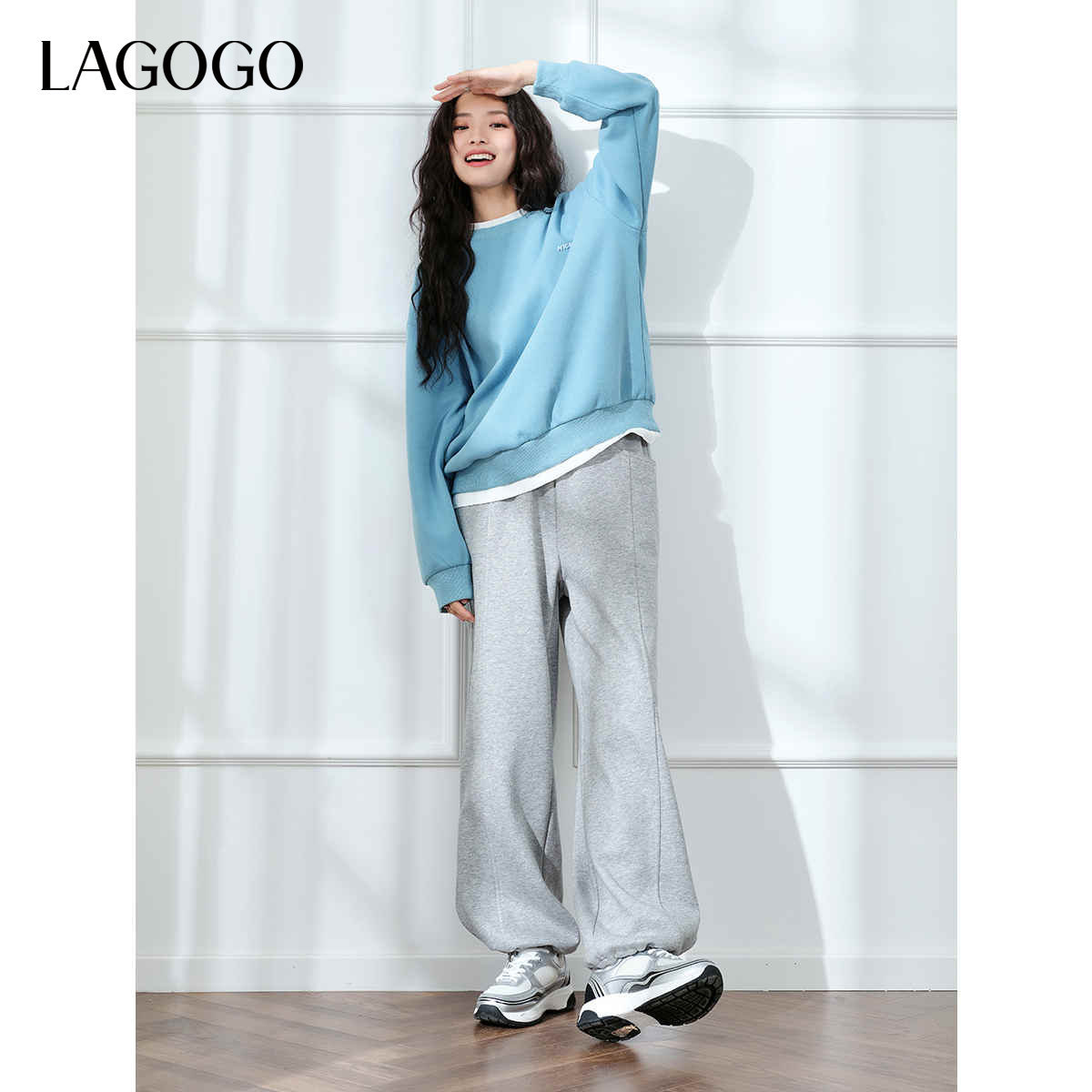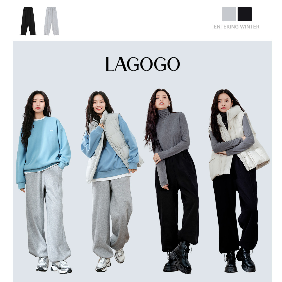 LAGOGO宽松高腰加绒休闲裤女拉谷谷冬季新款松紧腰束脚裤