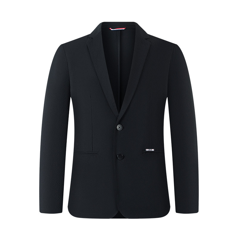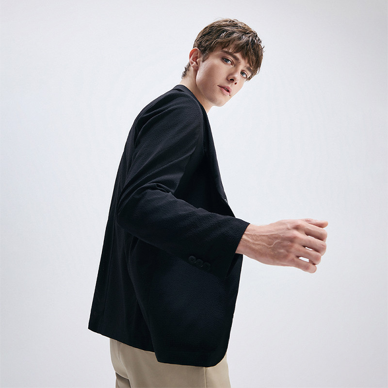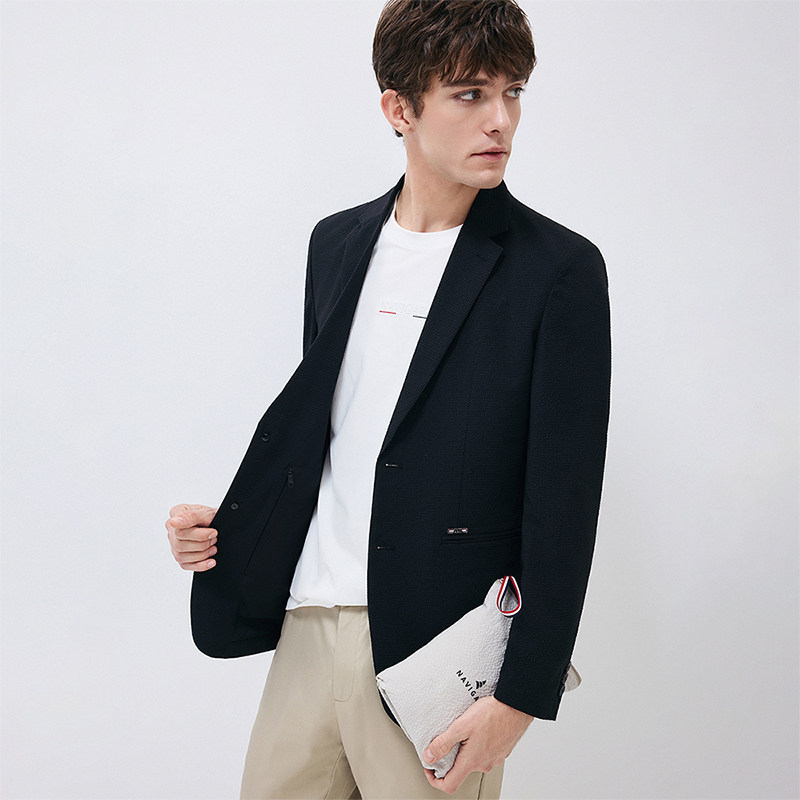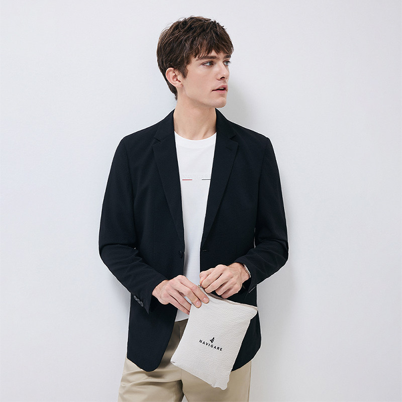 Navigare意大利小帆船黑色设计感休闲西服外套男士薄款泡泡纱西装