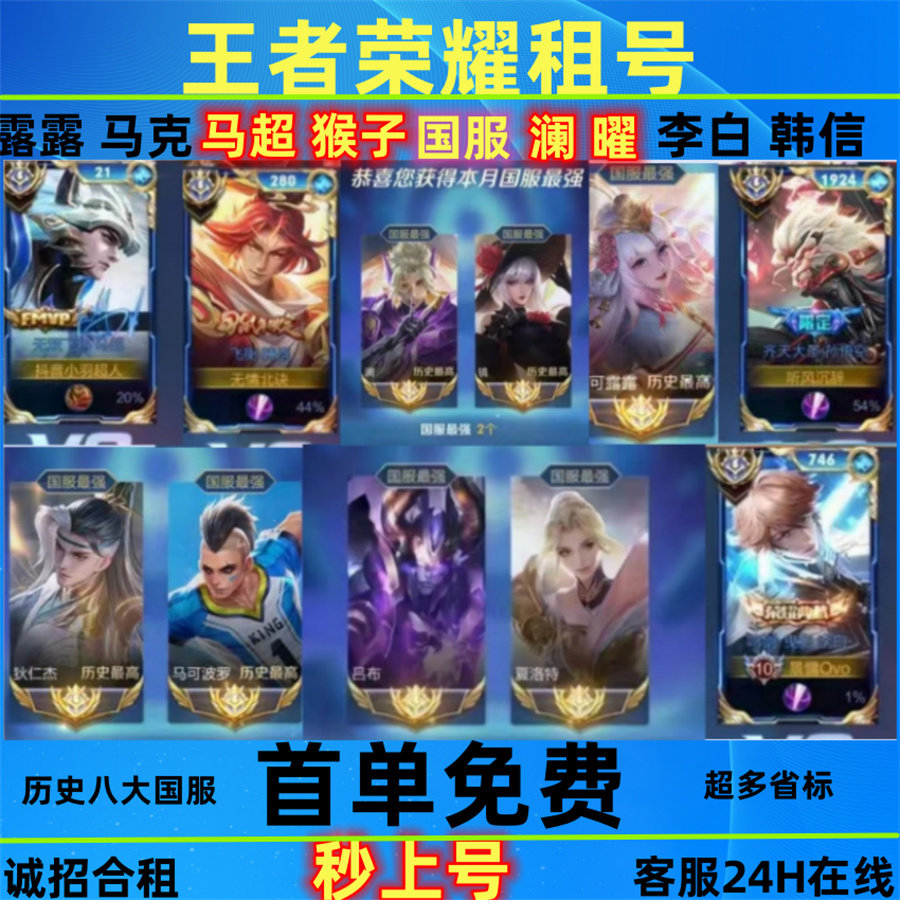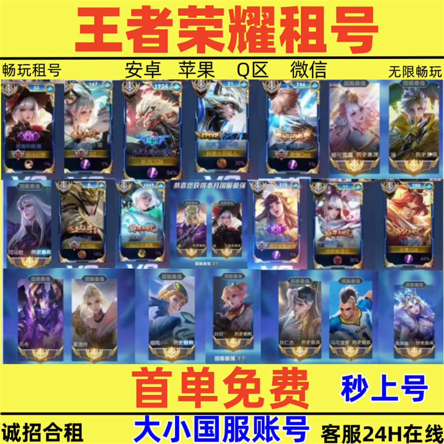 王者荣耀租号V10账号出租苹果安卓q区微信区可排位在榜国服号租借