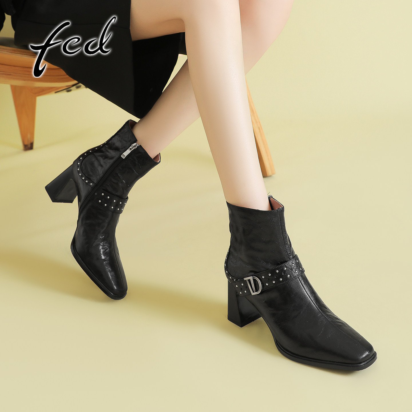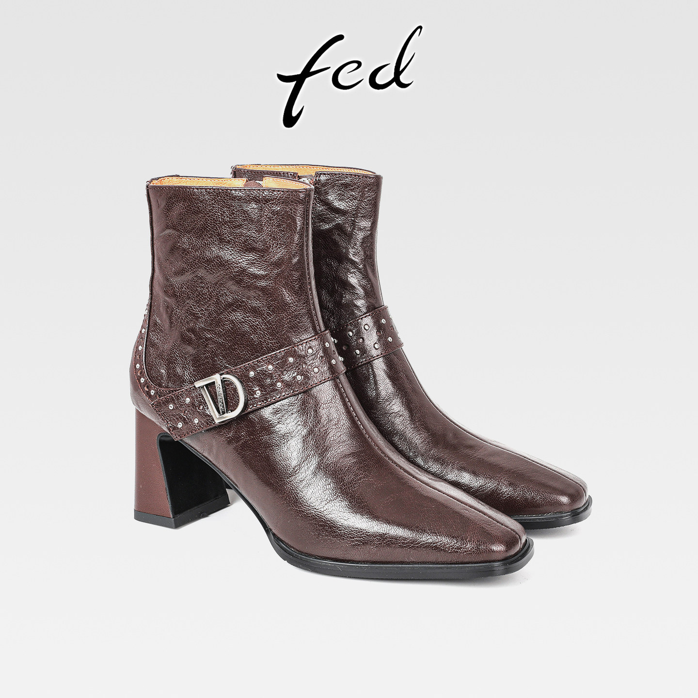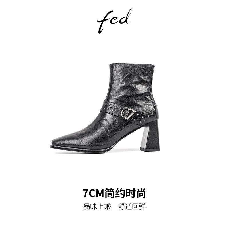 fed复古羊皮粗跟铆钉瘦瘦靴女秋冬新款侧拉链方头高跟洋气小短靴