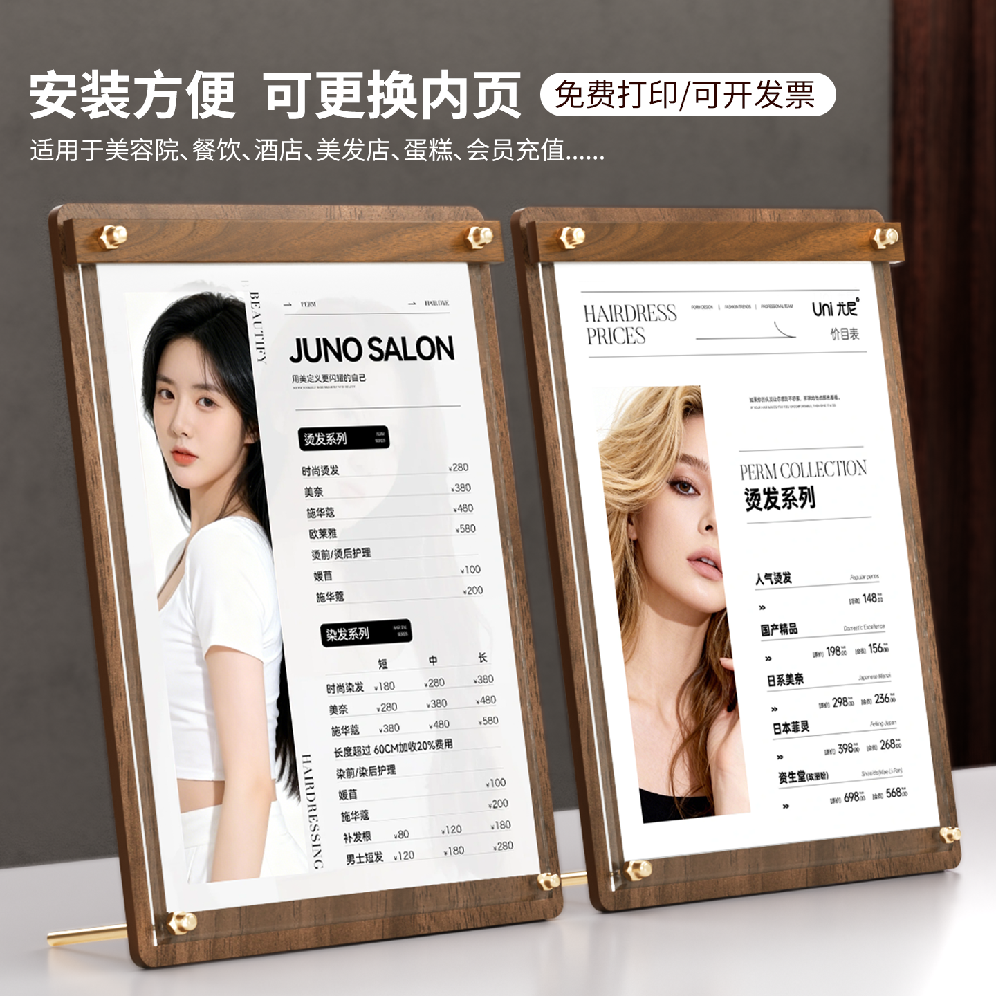 价目表展示牌亚克力a4立牌美容院美甲美睫奶茶店定制菜单纹绣价格保护会员充值设计制作高级木纹斜面台卡桌牌