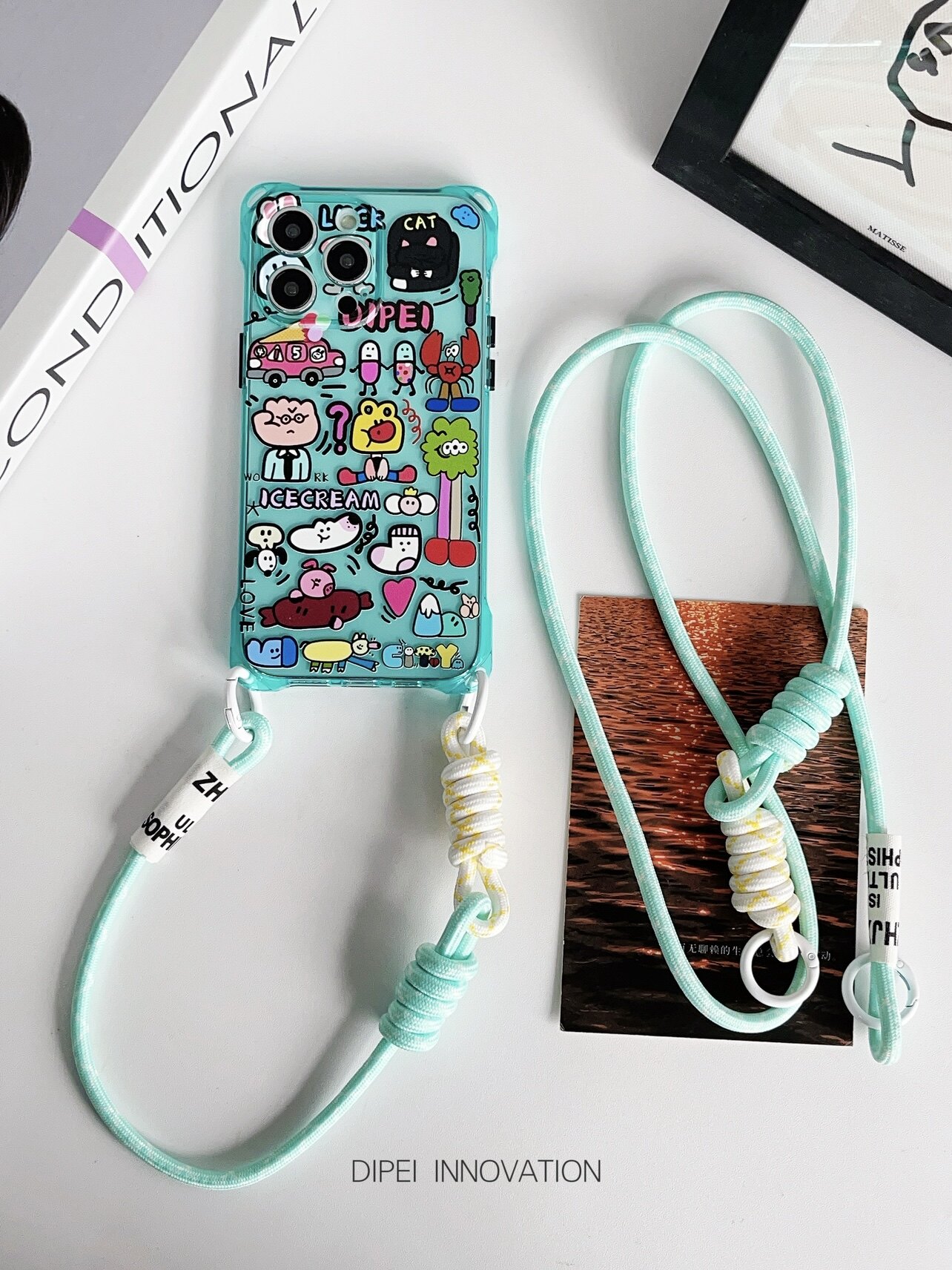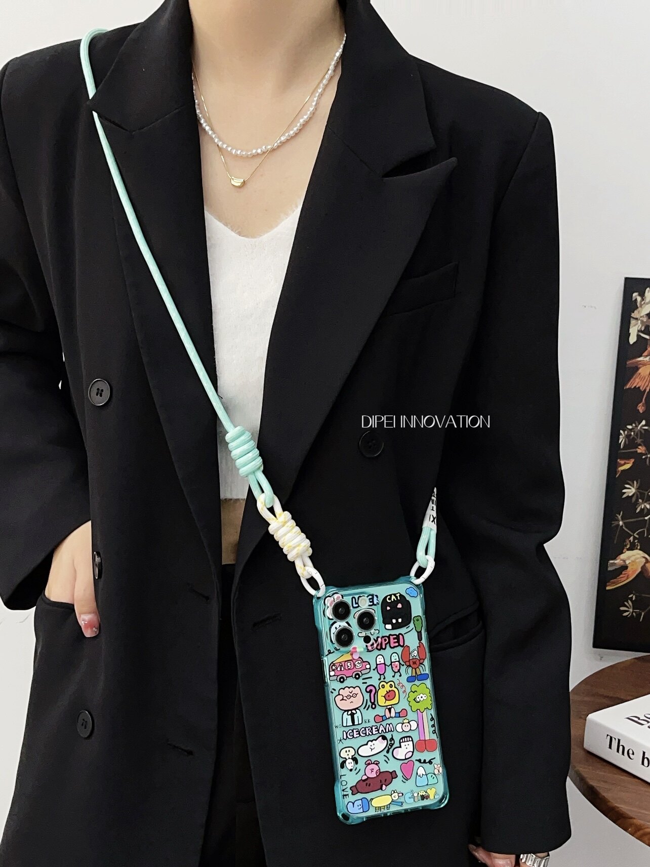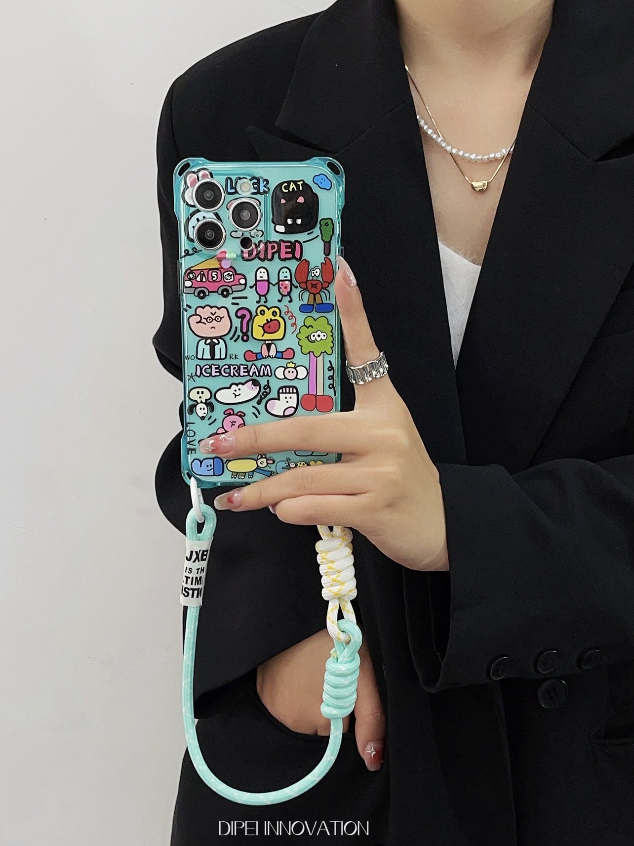 日韩卡通挂绳手机壳15Promax湖水蓝手腕挂绳适用苹果iPhone14四角开孔软12斜挎背带13Pro男女通用14plus原创
