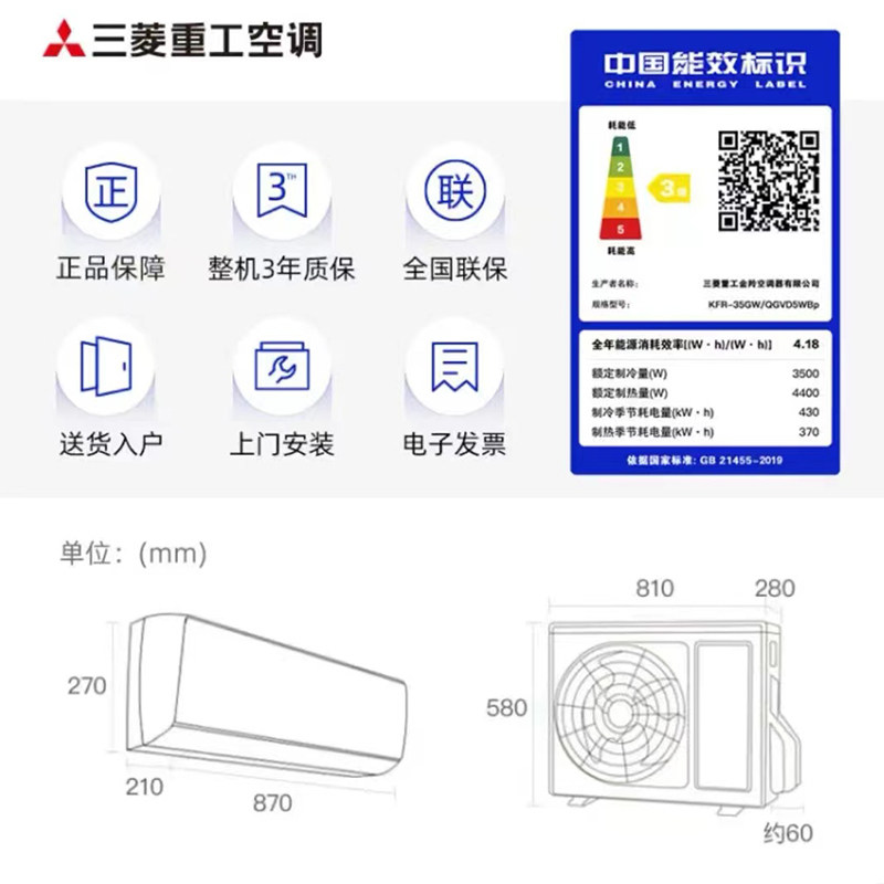 三菱重工3级能效变频空调1.5匹大风量智能挂机KFR-35GW/QGVD5WBp