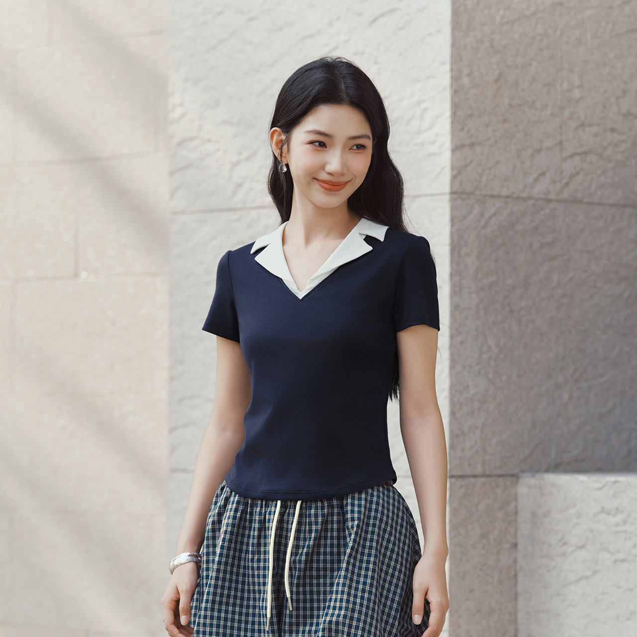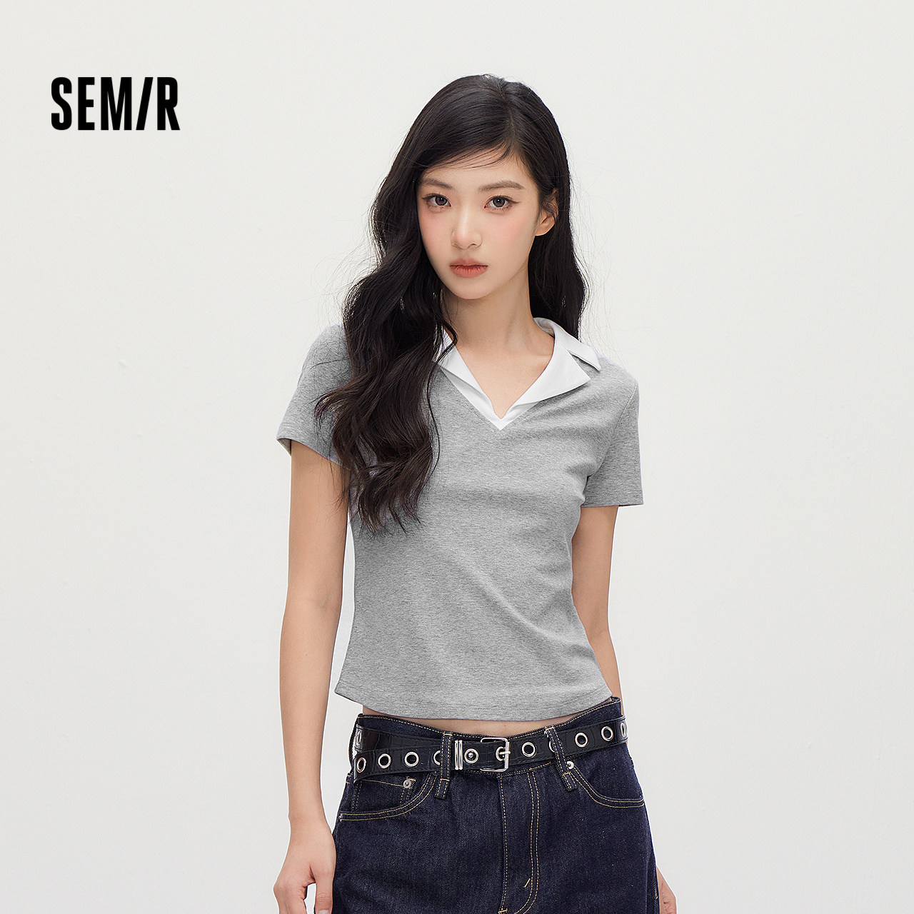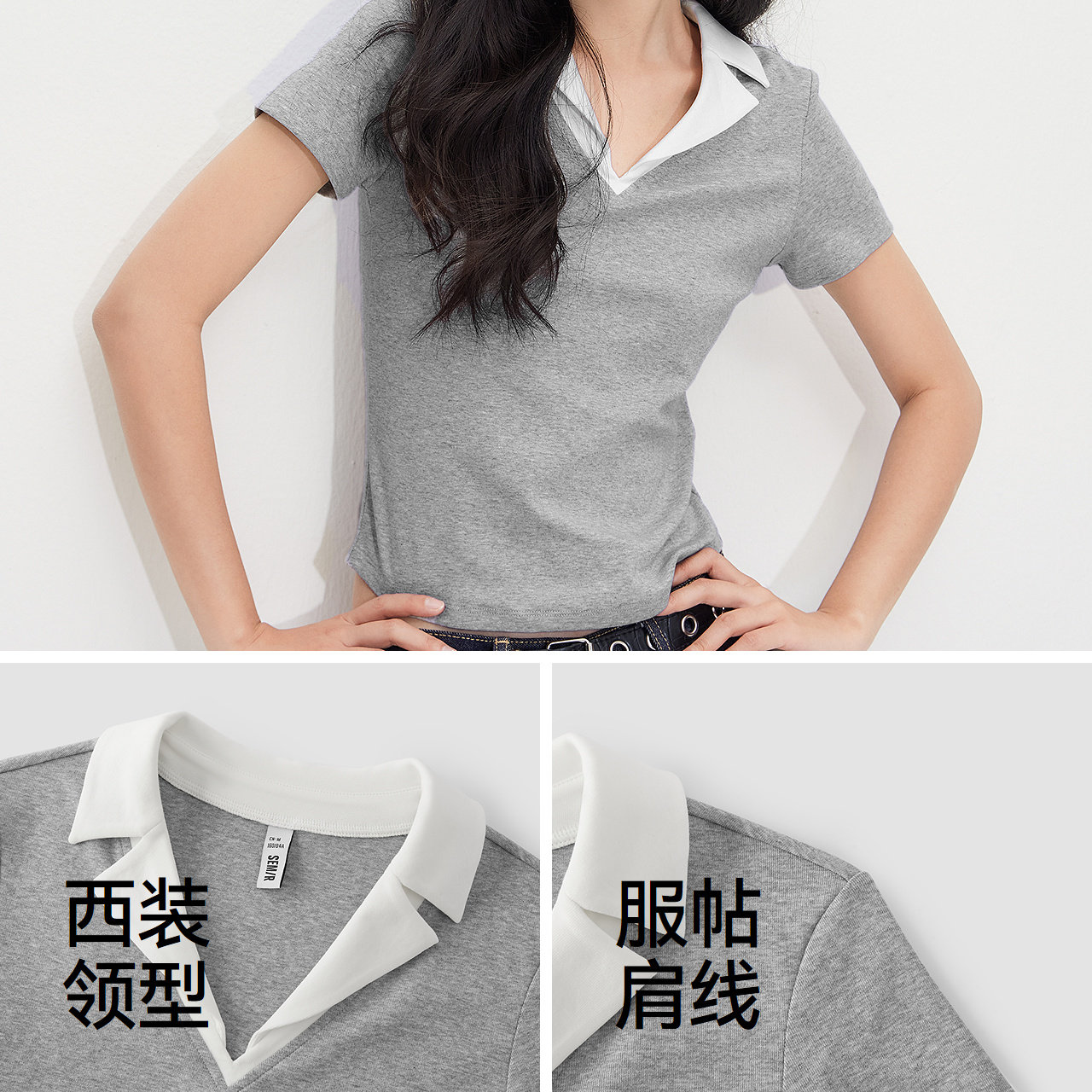 森马POLO衫女夏季短款凉感撞色西装领紧身套头衫2026新款通勤上衣