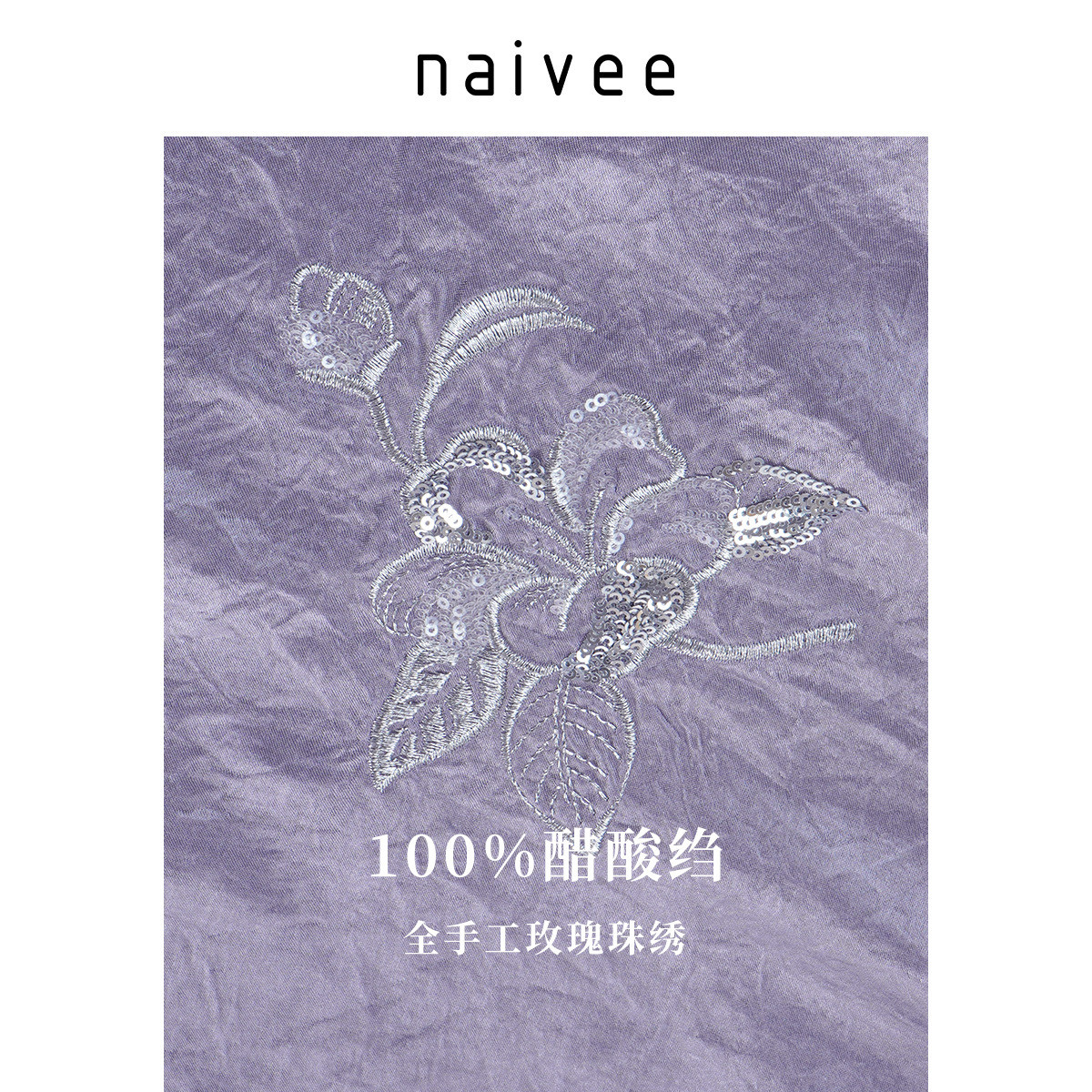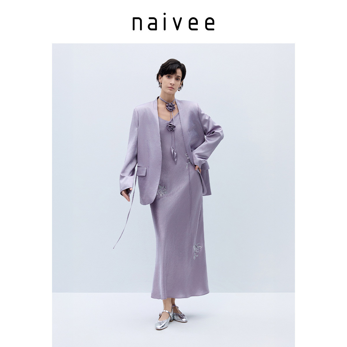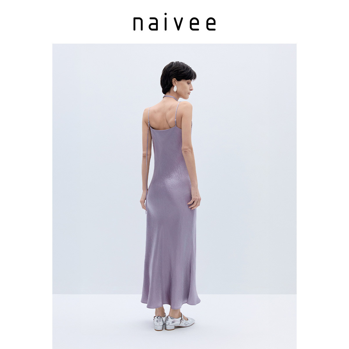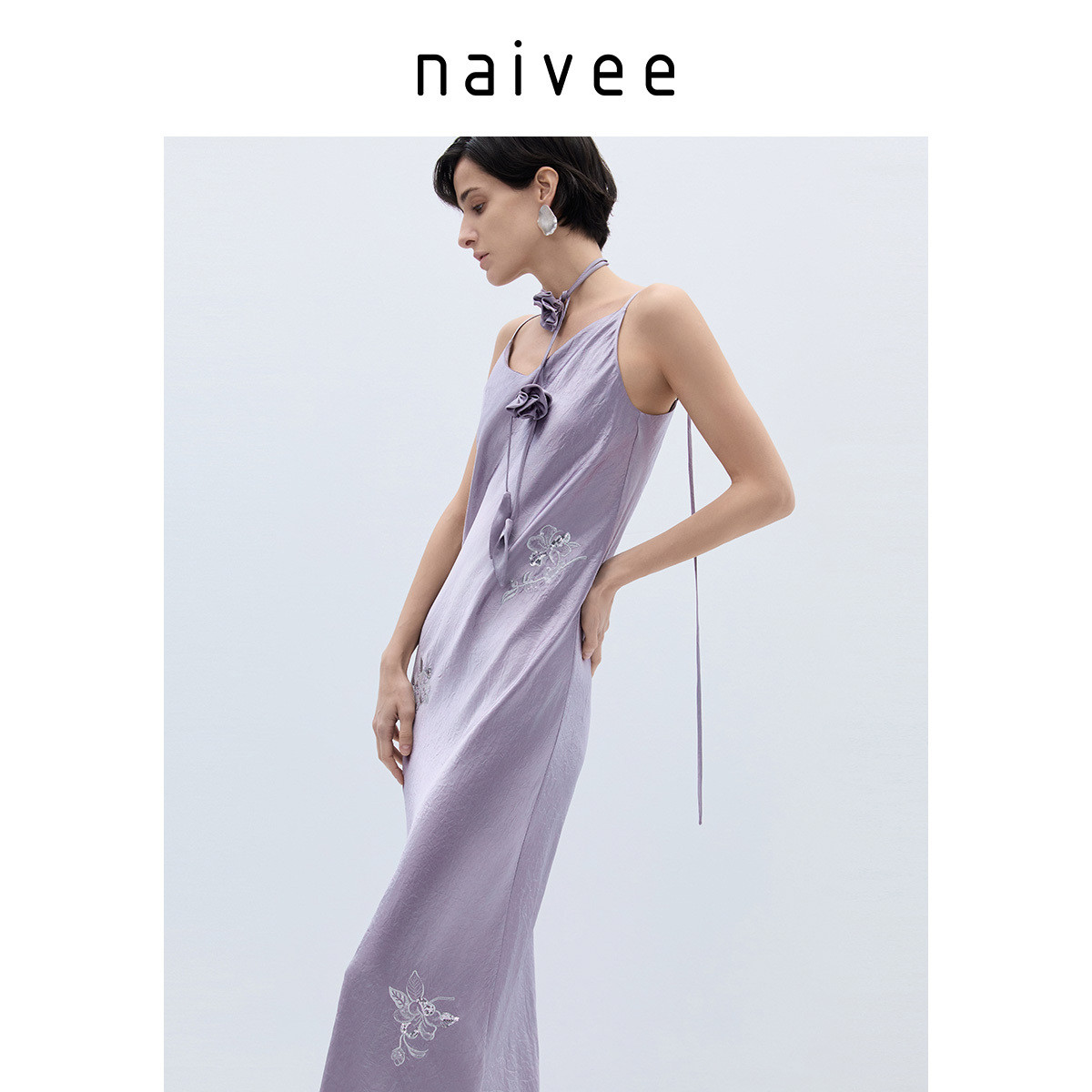 naivee纳薇醋酸紫色吊带裙长款度假约会珠绣轻礼服收腰显瘦连衣裙