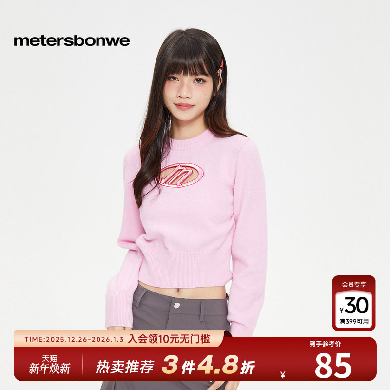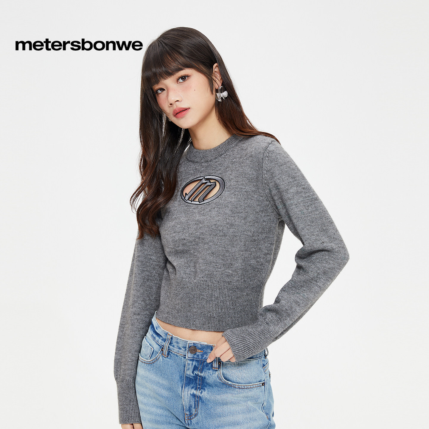 美特斯邦威时尚长袖毛衫女修身前片镂空圆领甜美设计感上衣秋冬