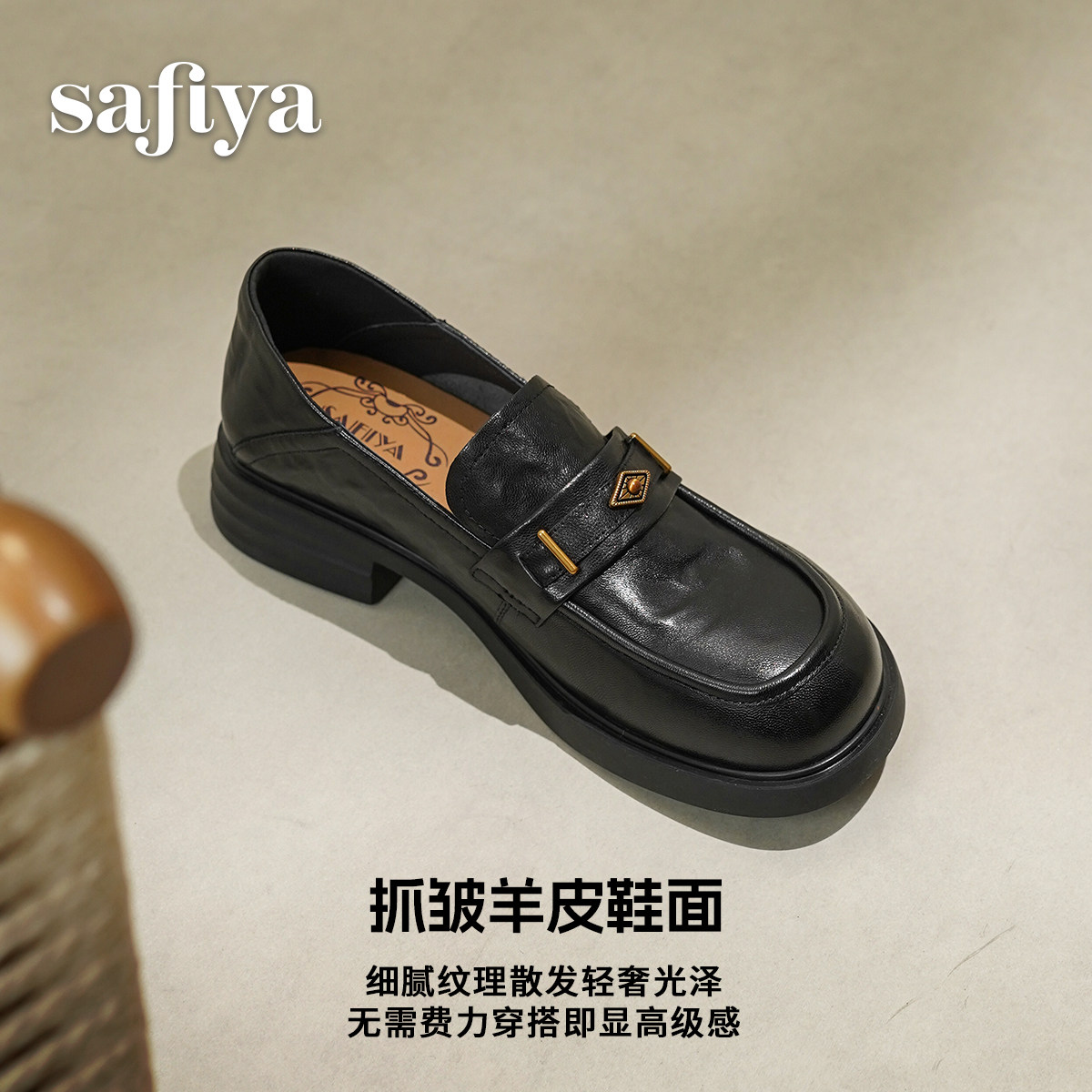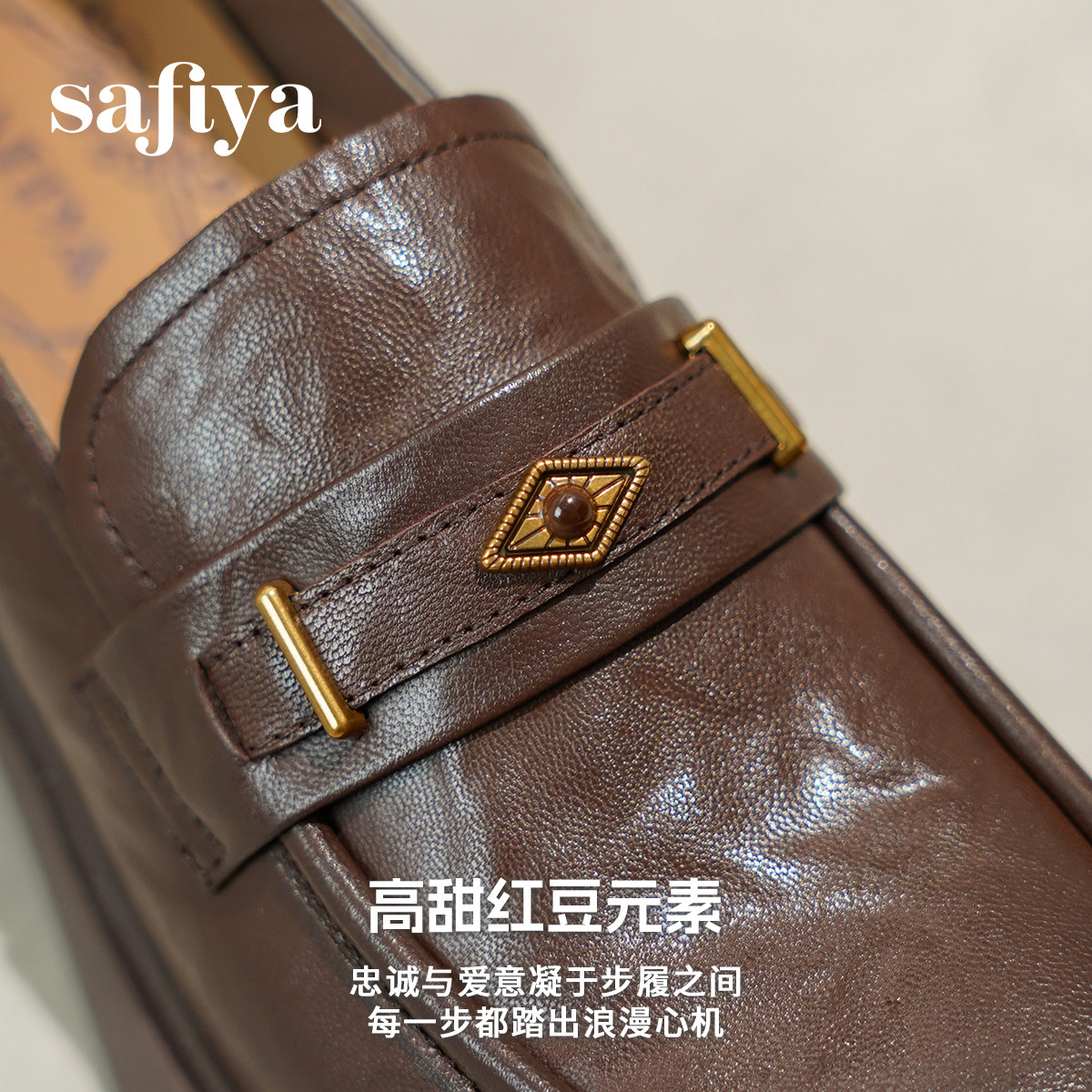 索菲娅2026春季新品英伦风羊皮软底粗跟百搭情人节红豆皮鞋乐福鞋