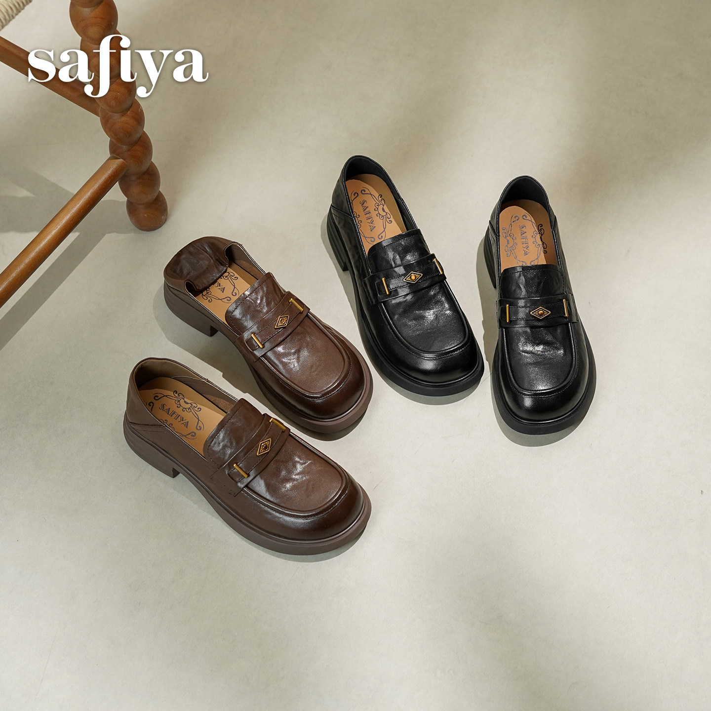 真皮~骄屿复古一脚蹬乐福鞋女厚底粗跟圆头单鞋百搭英伦风小皮鞋