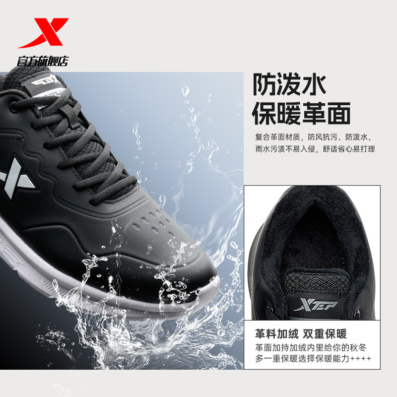 特步减震跑步鞋男鞋冬季革面防泼水运动鞋舒适休闲鞋加绒跑鞋棉鞋