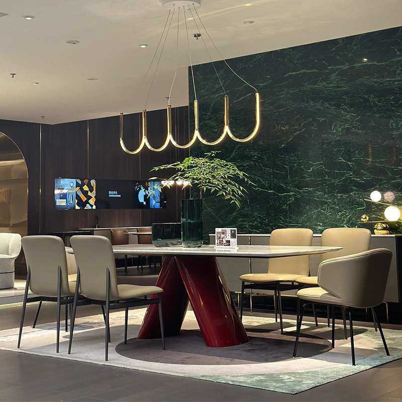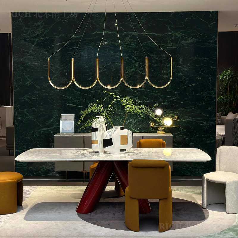 卡里冰玉大理石餐桌不锈钢红色高亮光烤漆现代长方形家用餐厅饭桌