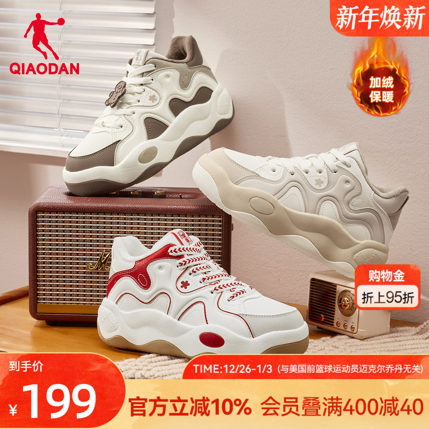 乔丹红色加绒保暖棉鞋皮面防水女款2025冬季新款运动板鞋厚底增高
