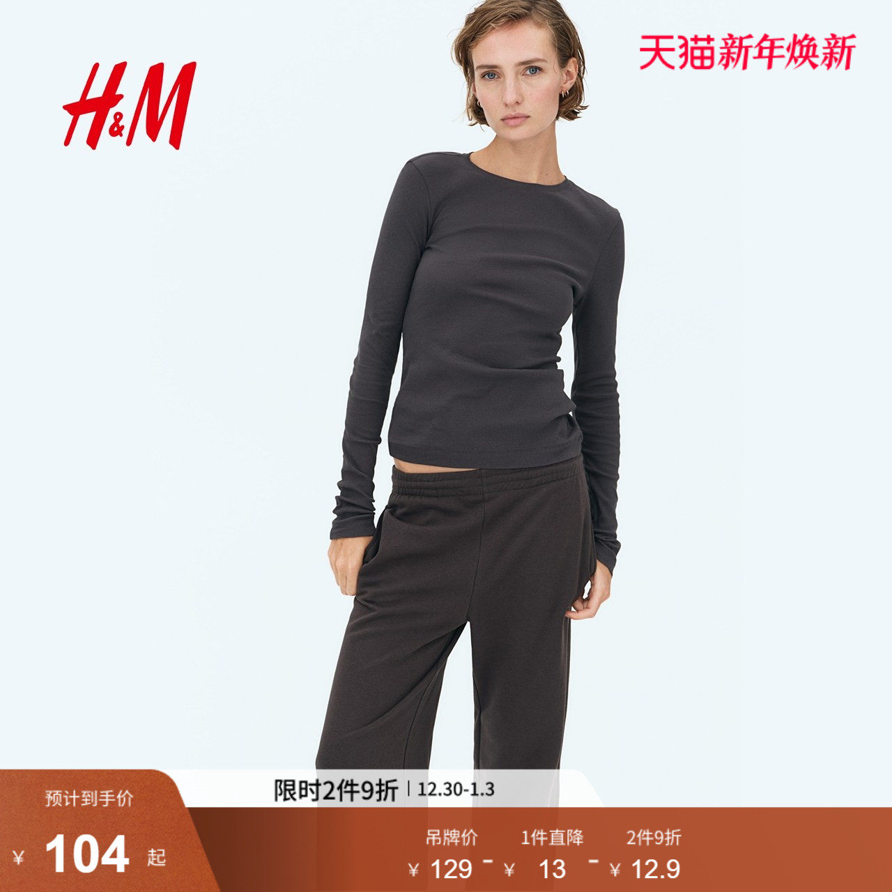 HM女装T恤2025冬季新款时尚气质长袖圆领罗纹棉质打底上衣1266889