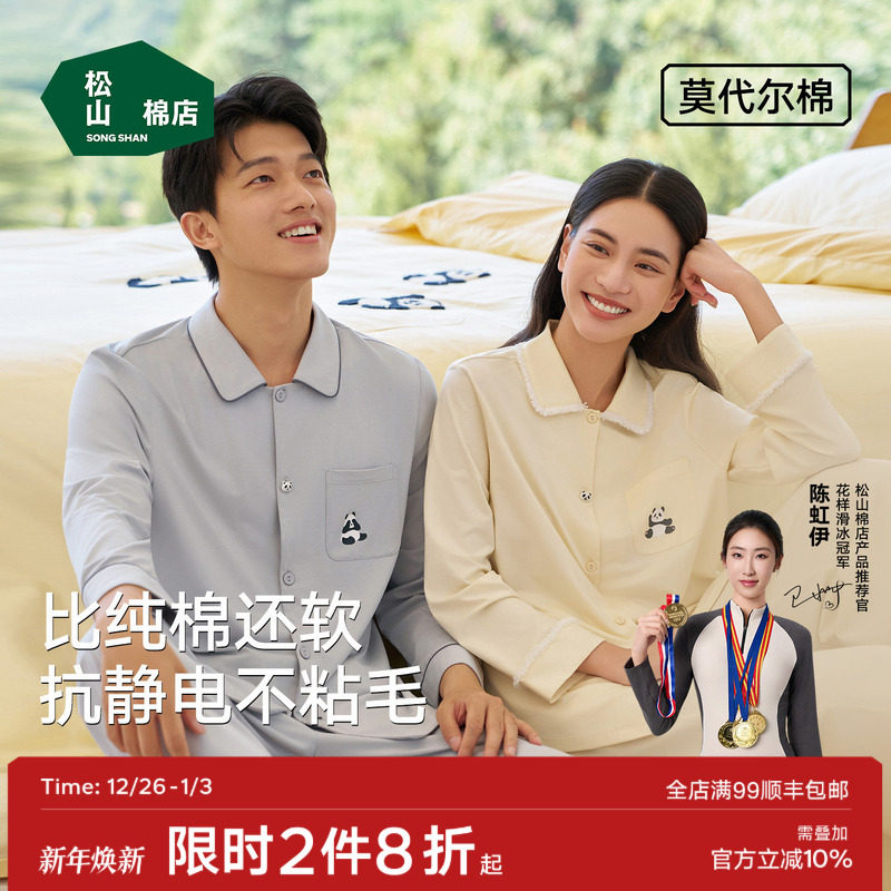 松山棉店松团儿长袖开衫情侣家居服套装棉莫抗静电睡衣男士女士秋
