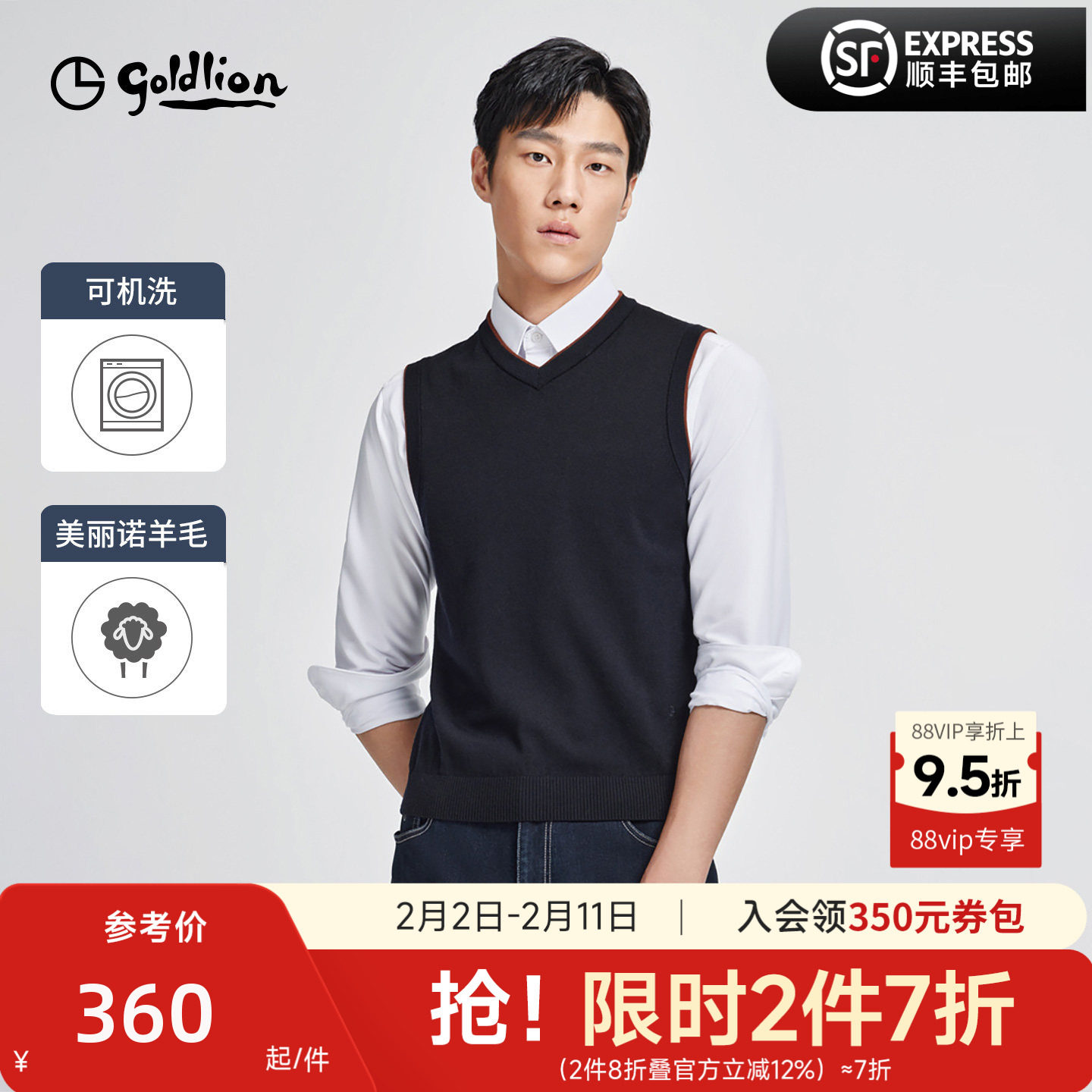 【100%羊毛背心】金利来秋冬可机洗毛织马甲背心毛衣V领针织衫男