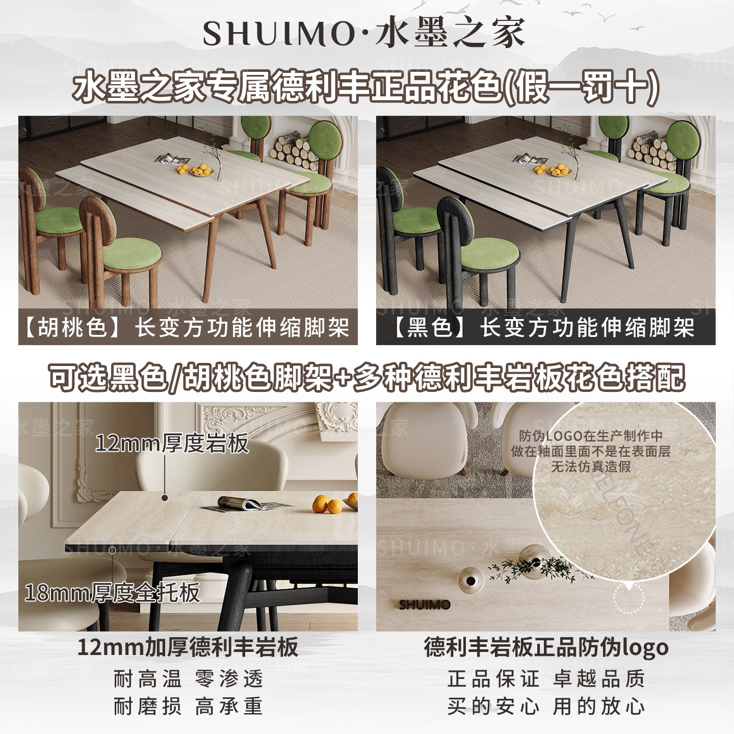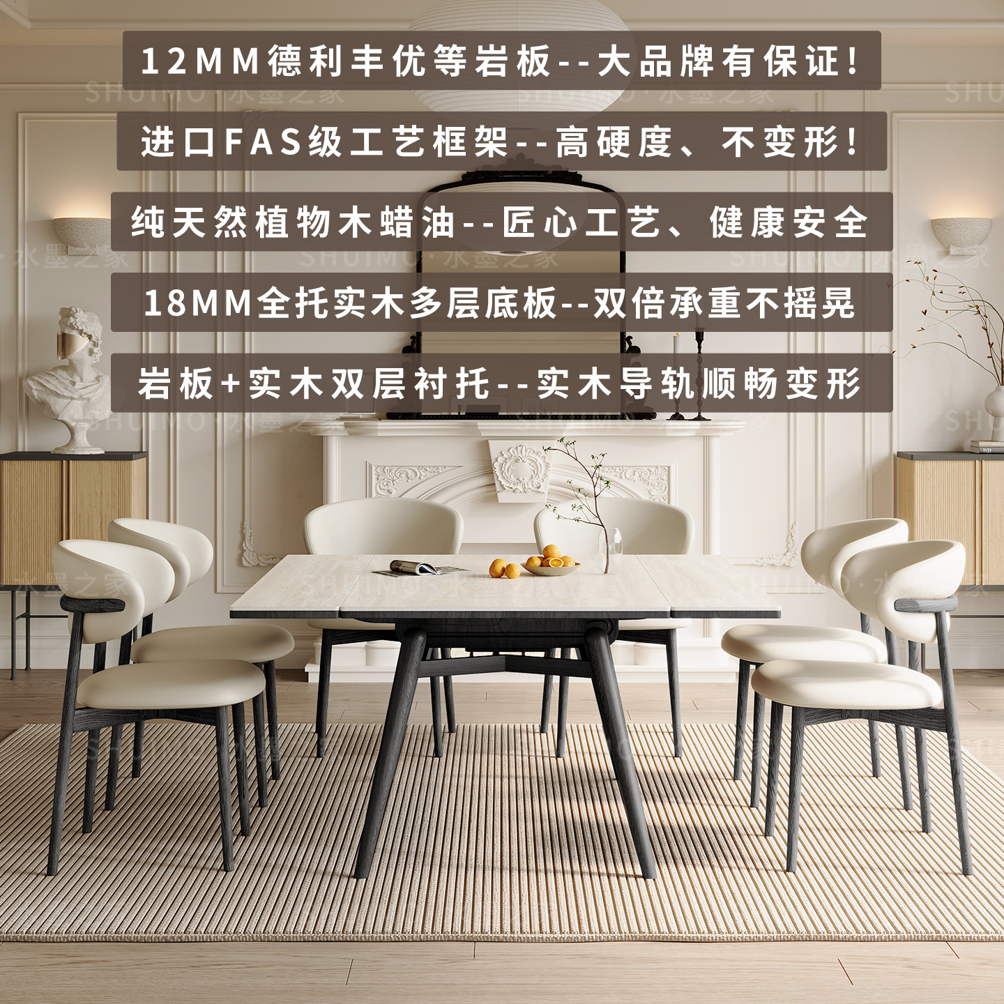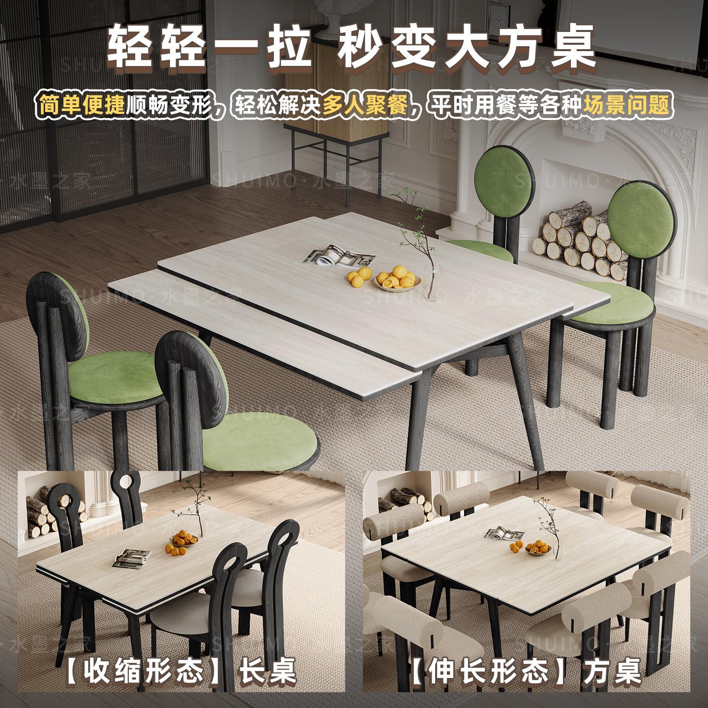 可伸缩德利丰岩板餐桌实木变长小户型长方形白蜡木中古风折叠桌子