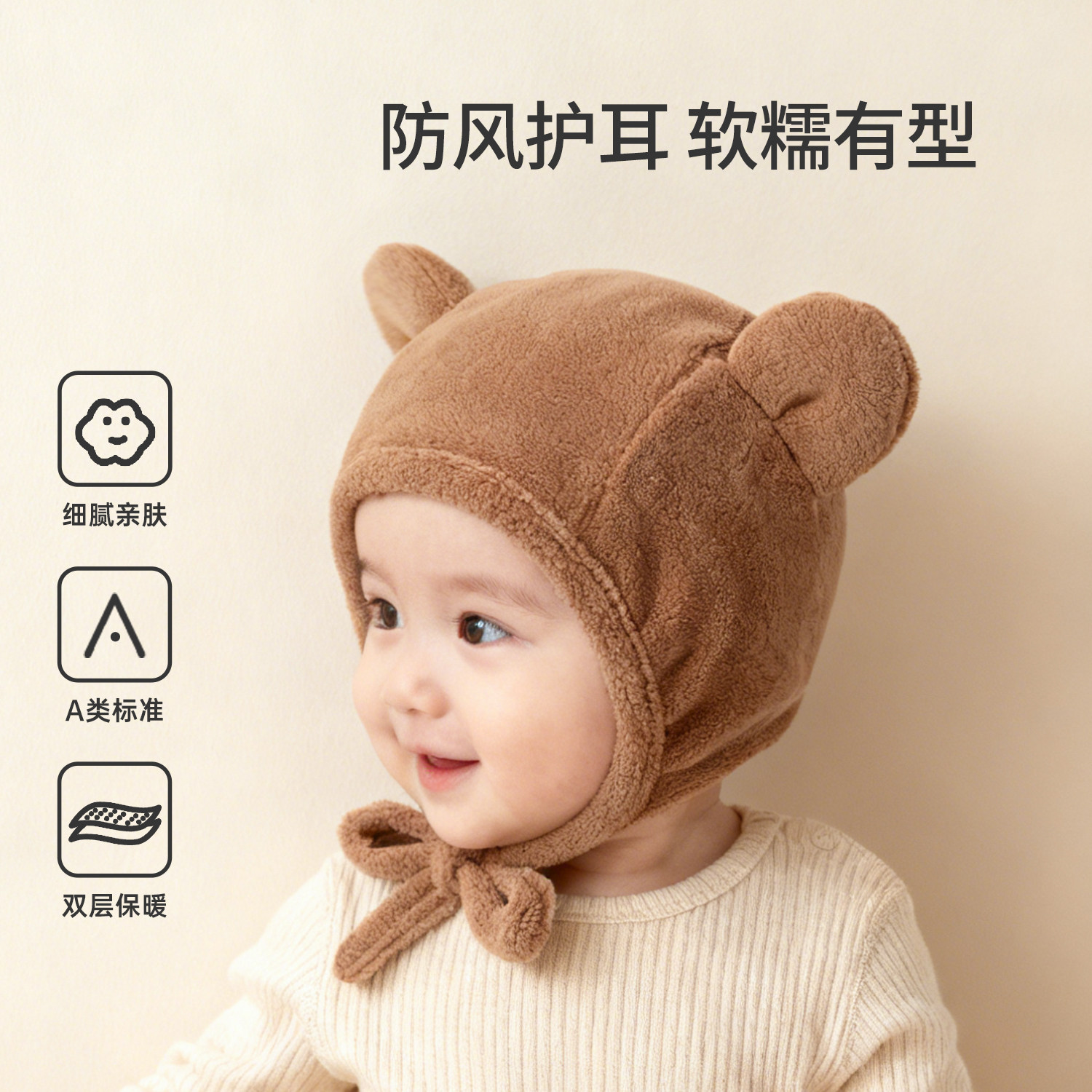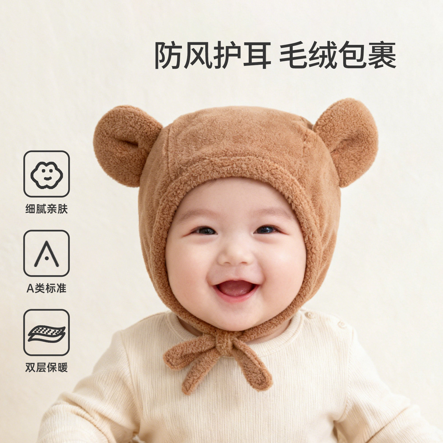 婴儿帽子秋冬季男宝宝女加绒保暖护耳帽新生儿冬天防风小月龄胎帽