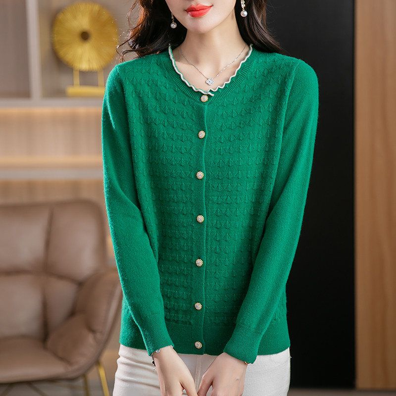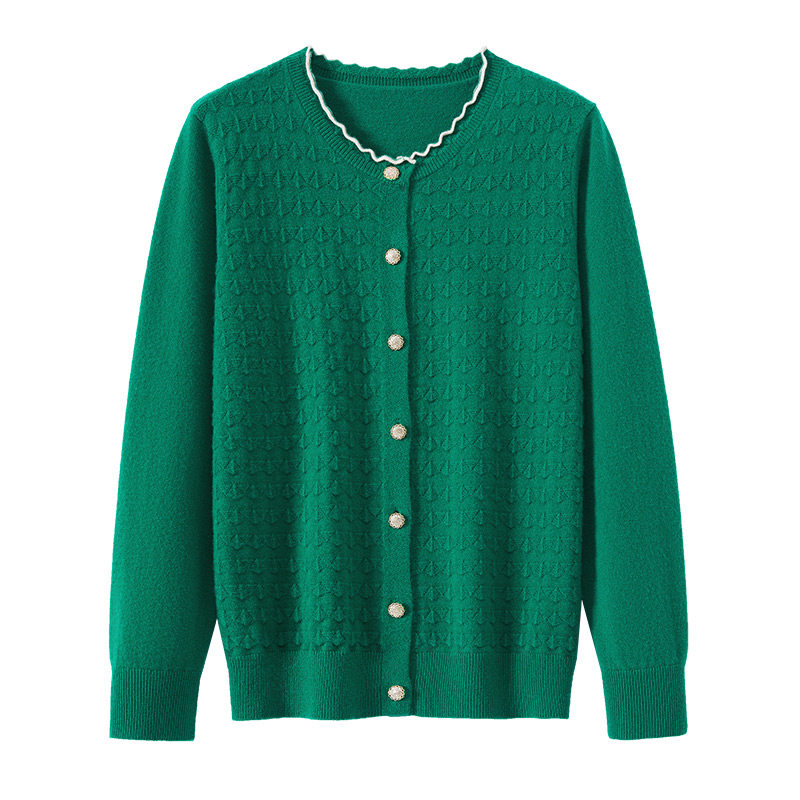 恒源祥女士100%羊毛开衫纯色绿色毛衣女春装外穿宽松针织打底衫