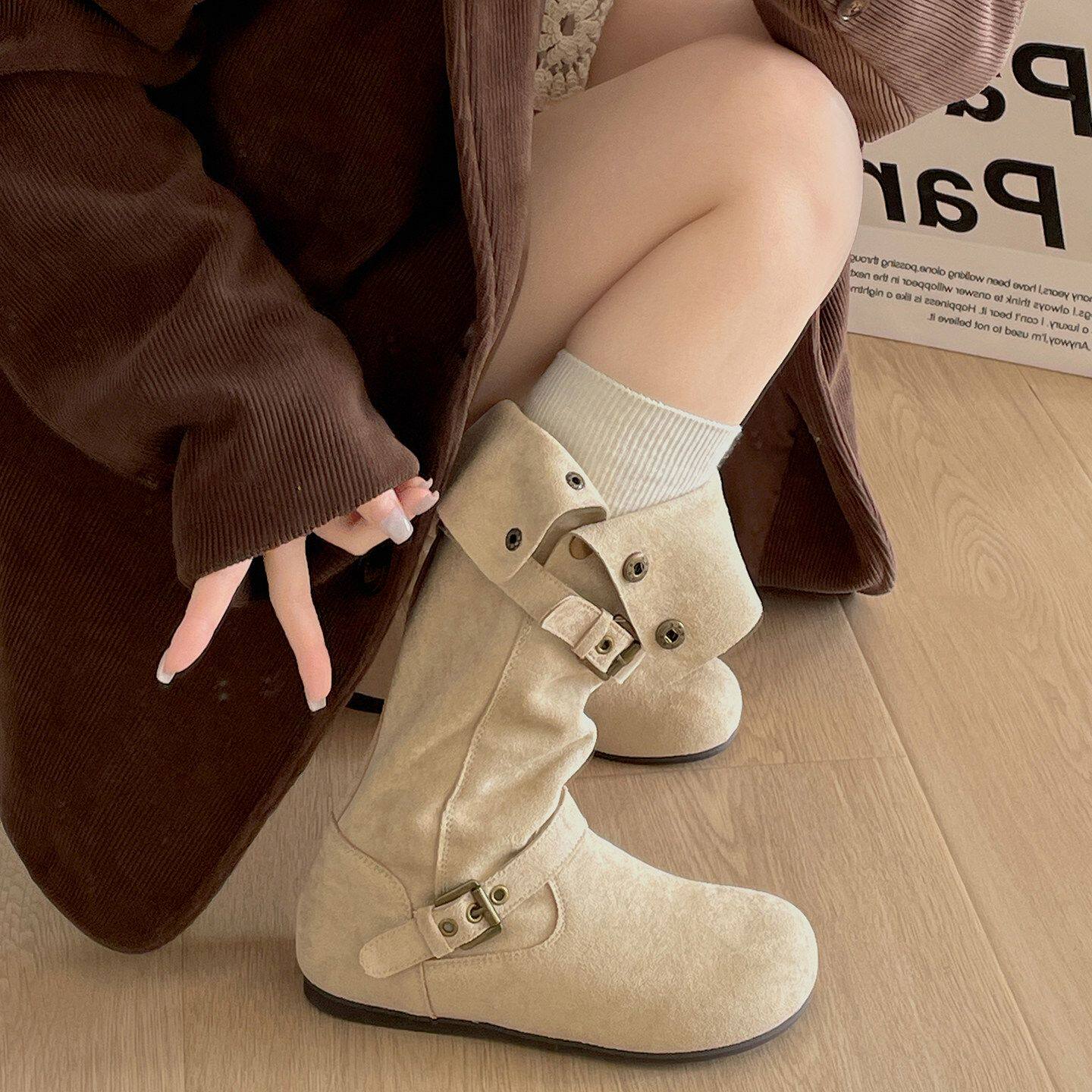 真皮~内增高西部牛仔堆堆靴女2025秋褶皱裤管短靴复古骑士马丁靴