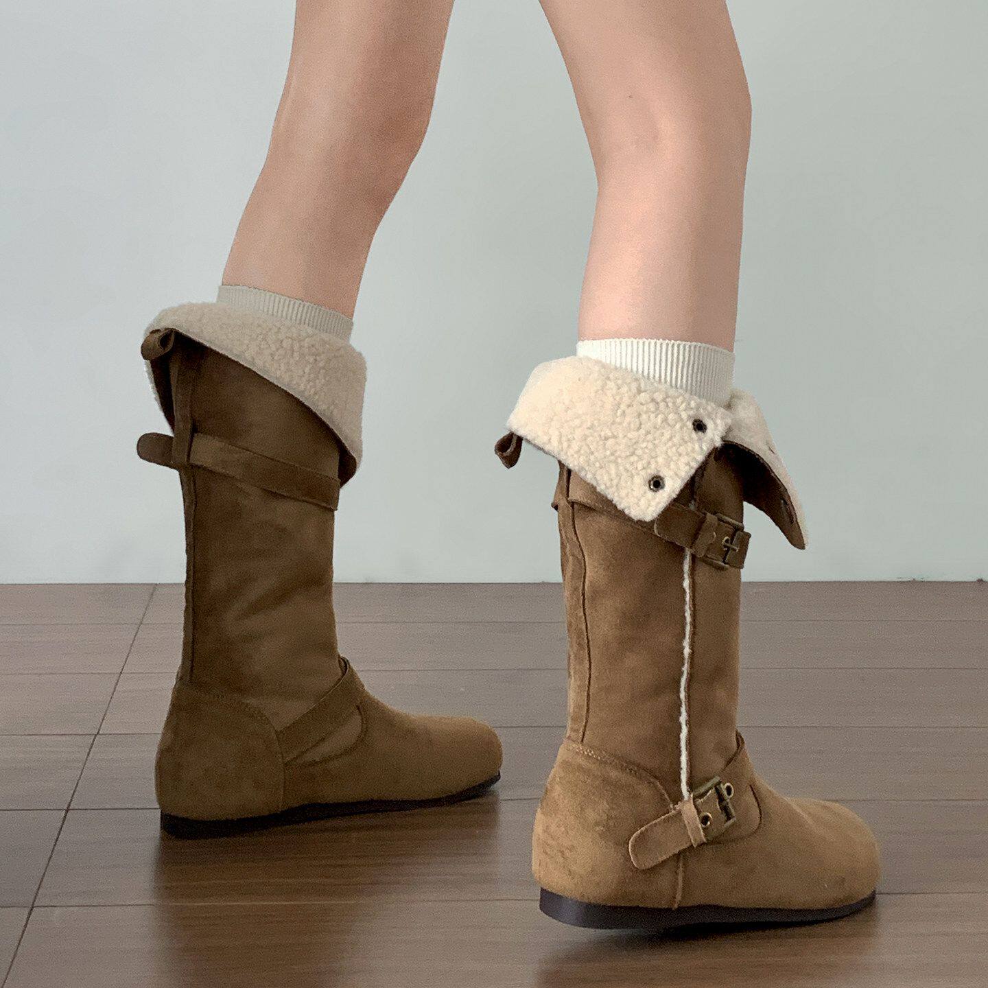 牛皮~骄屿复古圆头雪地靴加绒保暖毛毛棉靴两穿平底棕色勃肯短靴