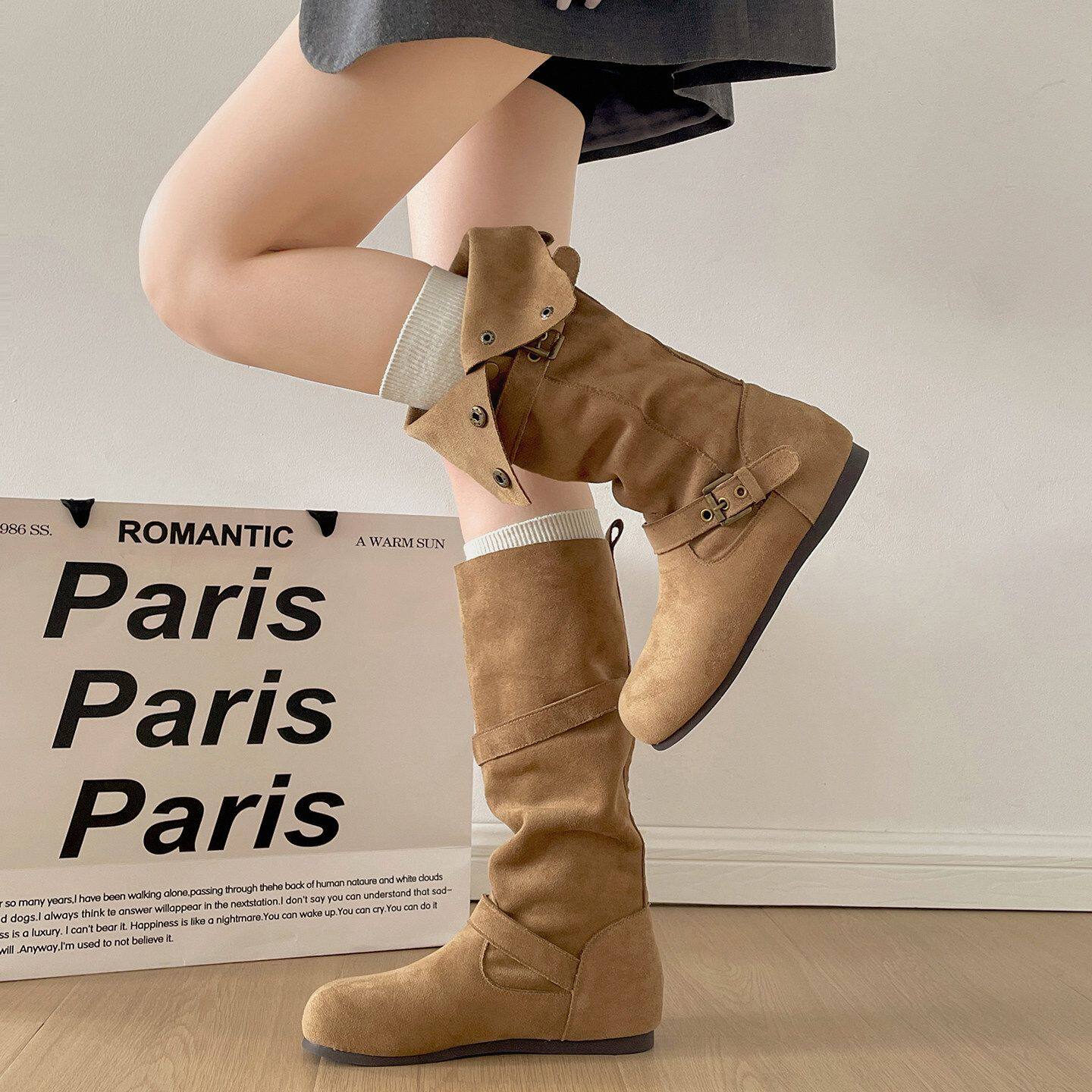 真皮~内增高粗跟骑士靴女秋冬西部靴高筒复古显瘦褶皱堆堆靴长靴