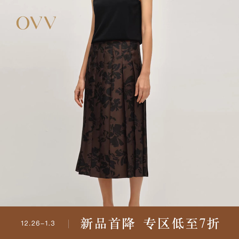 OVV2025秋冬新款女装16MM印花斜纹绸真丝百褶半身裙