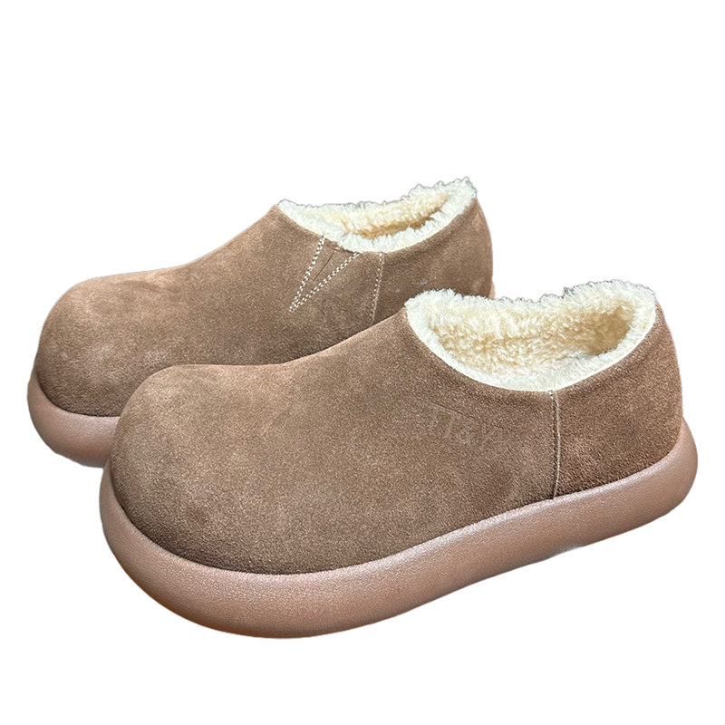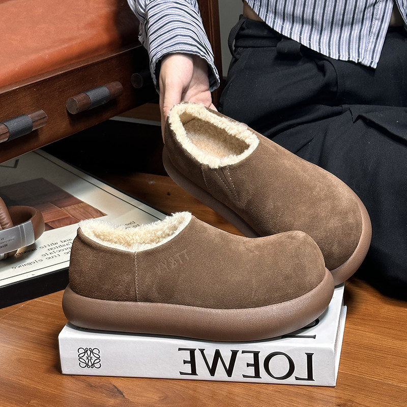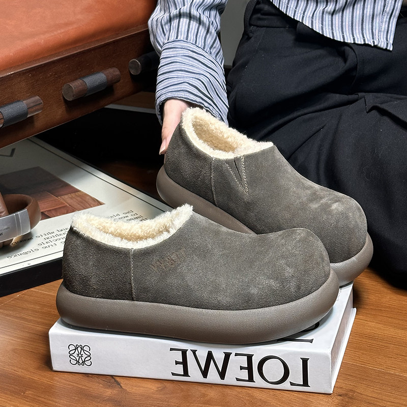 磨砂牛皮松糕厚底大头勃肯鞋女复古真皮圆头增高一脚蹬懒人毛毛鞋