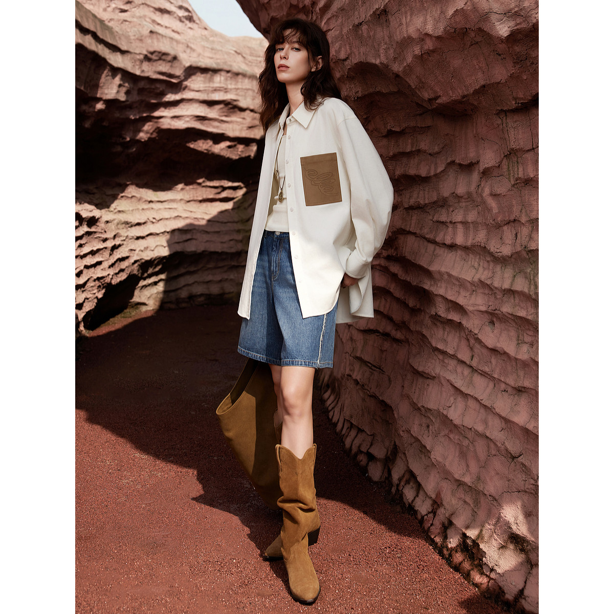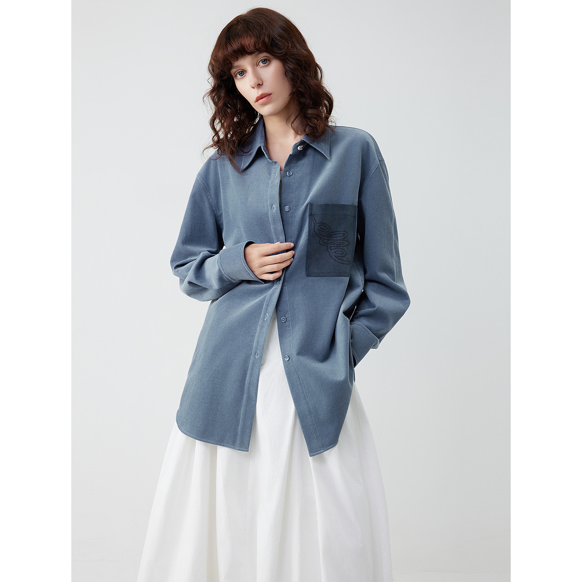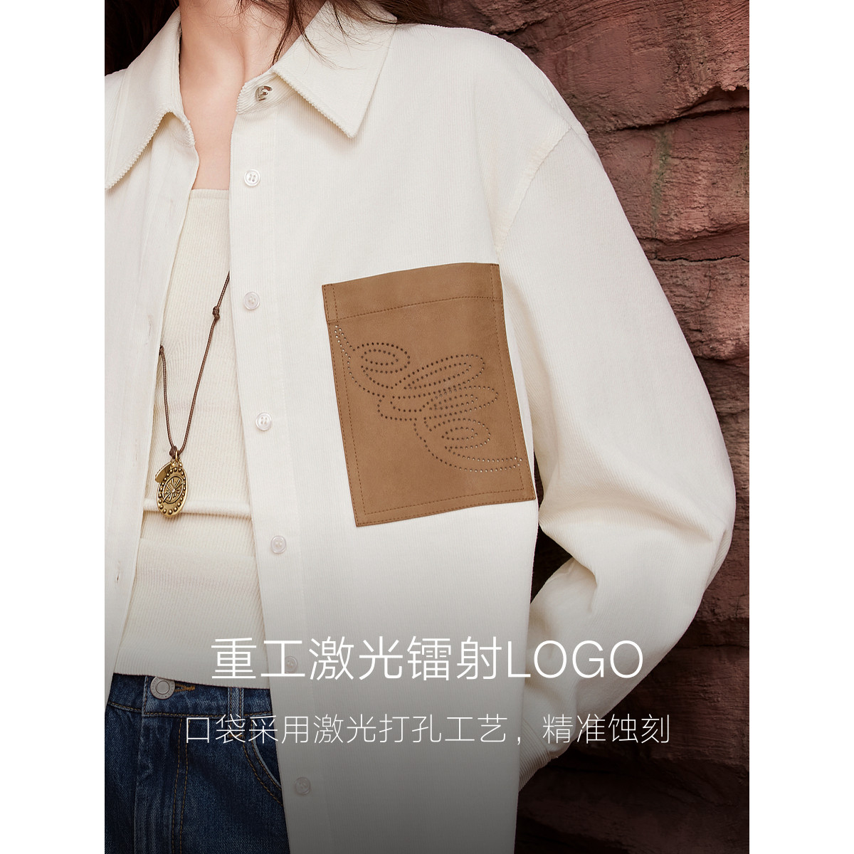 ELLE法式松弛感灯芯绒衬衫女2025秋季新款廓形通勤宽松拼接衬衣