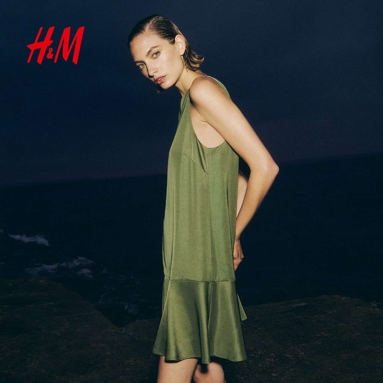 HM女装连衣裙春季新款圆领宽松直筒喇叭形A字连衣裙1296027