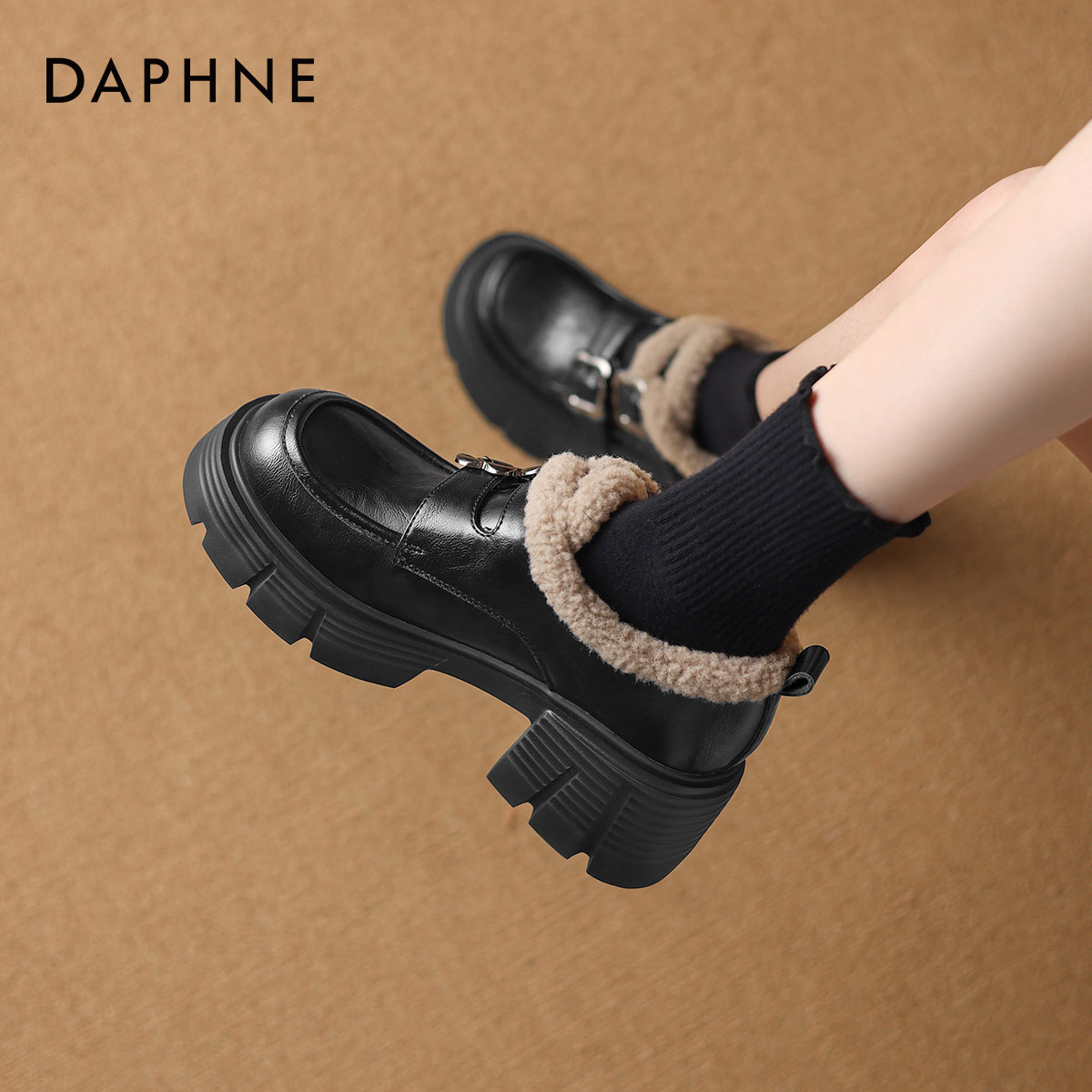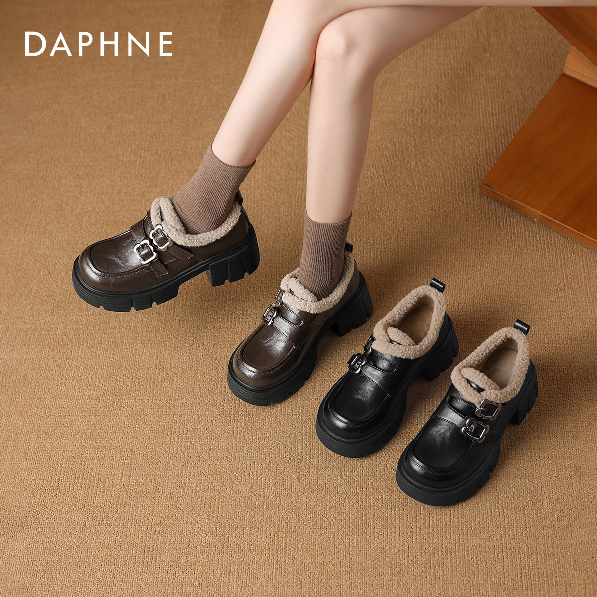 达芙妮厚底加绒乐福鞋女2026新款毛毛鞋棉鞋冬季豆豆鞋高跟小皮鞋