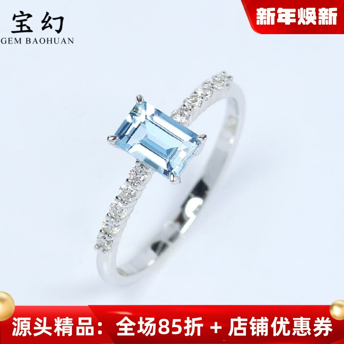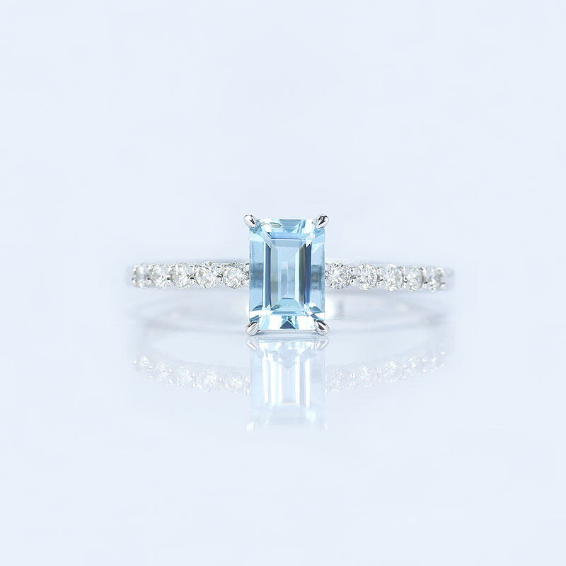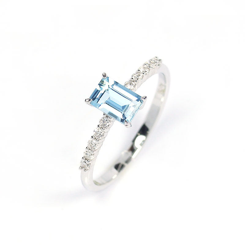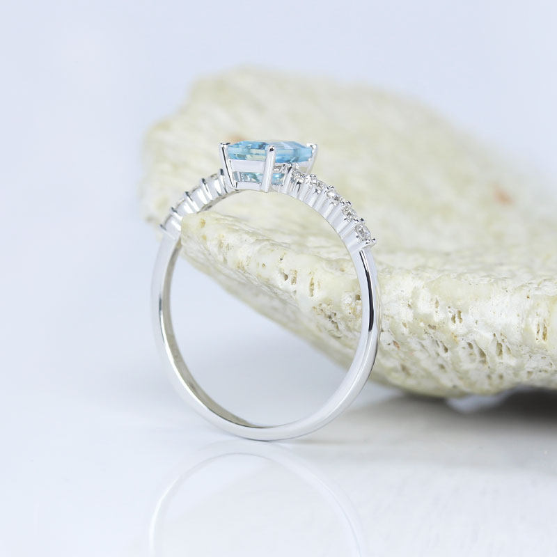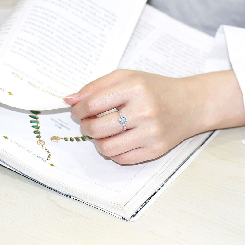 18K白金天然海蓝宝石长方形小戒指 镶钻石尾戒指环清新女款正品