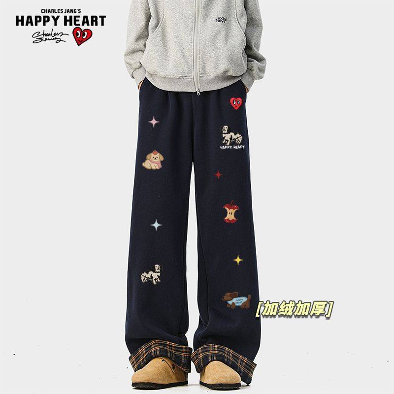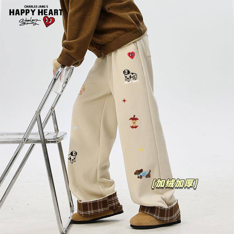 查尔斯桃心小狗印花美式加绒加厚裤子男女冬