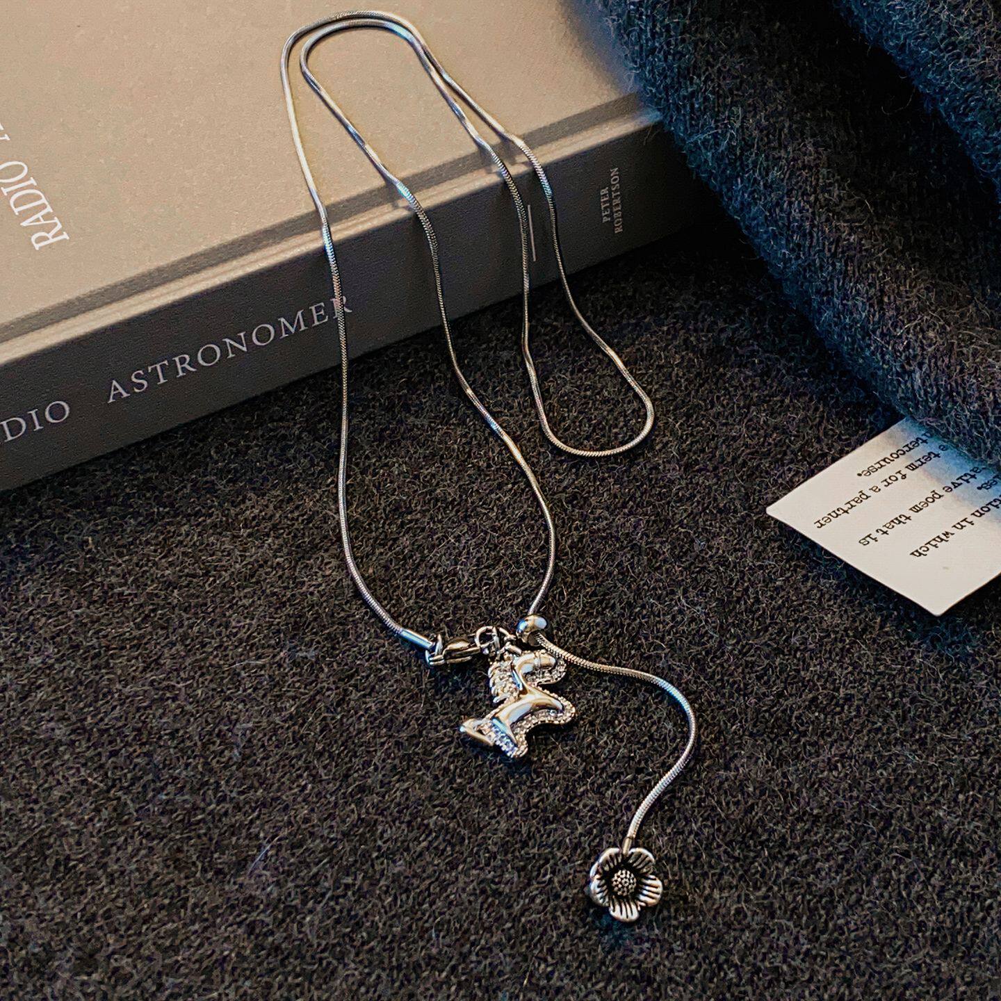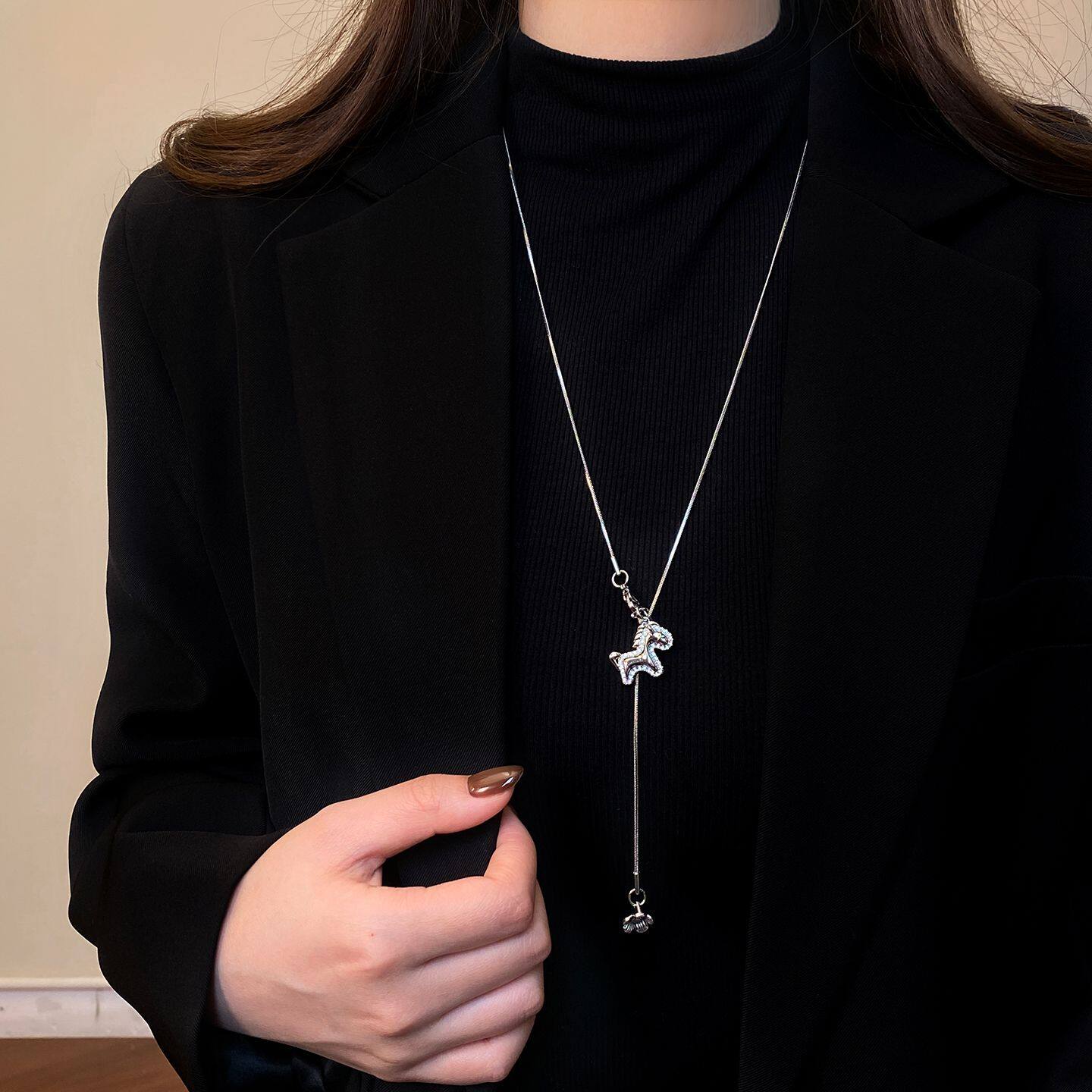许妍同款银色小马吊坠项链女高级感轻奢小众毛衣链秋冬长款配饰品
