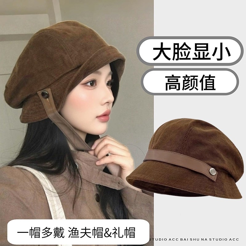 日系美拉德灯芯绒渔夫帽子女秋冬2025新款气质百搭贝雷帽一帽多戴