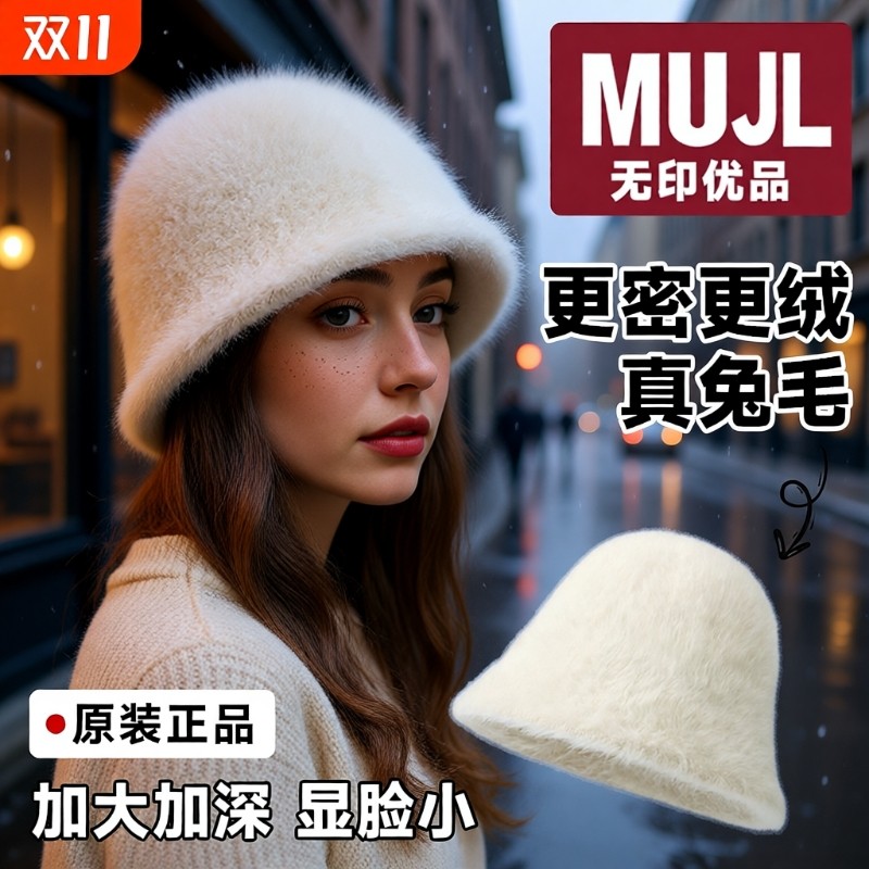 兔毛渔夫帽女2024新款秋天冬季毛绒白色帽子大头围显脸小保暖盆帽