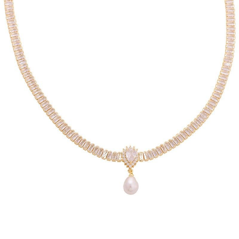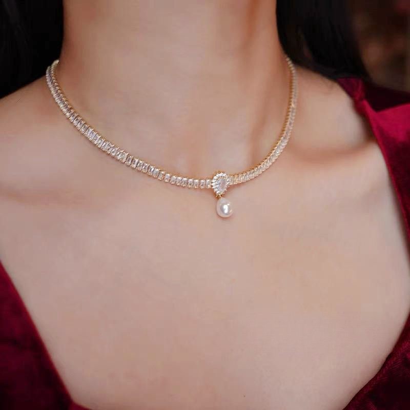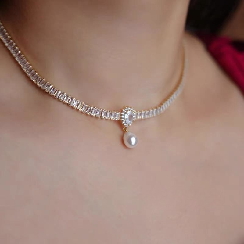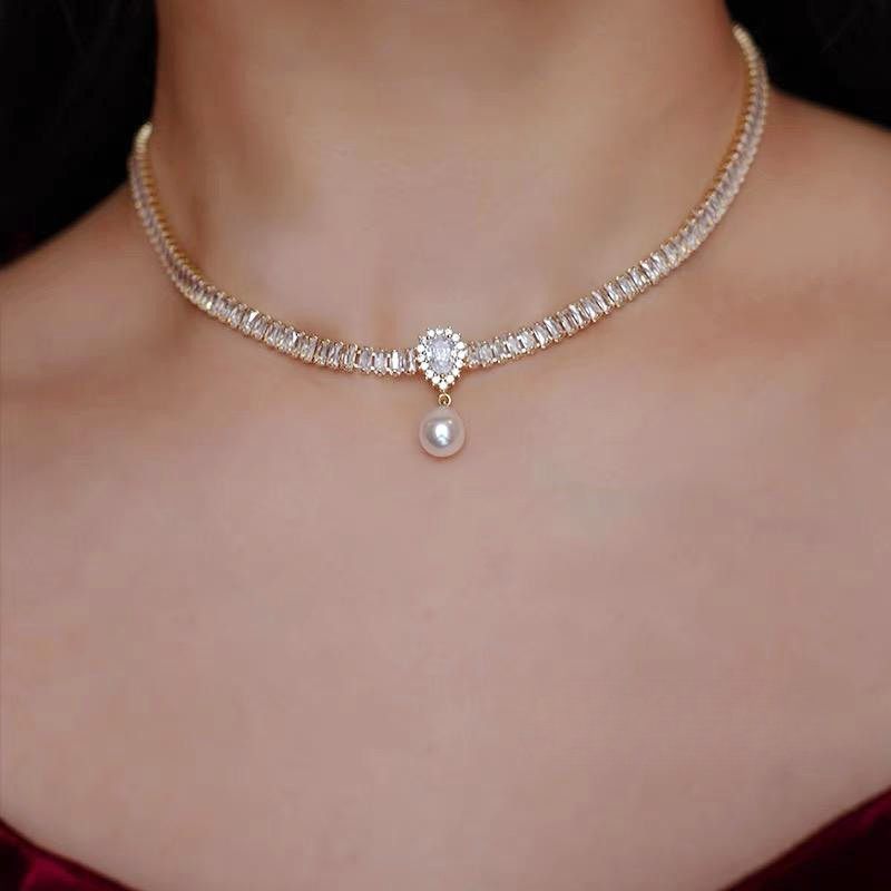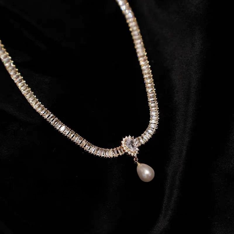 水晶颈链高级感轻奢复古重工项链女铜镶锆石巴洛克水滴珍珠锁骨链