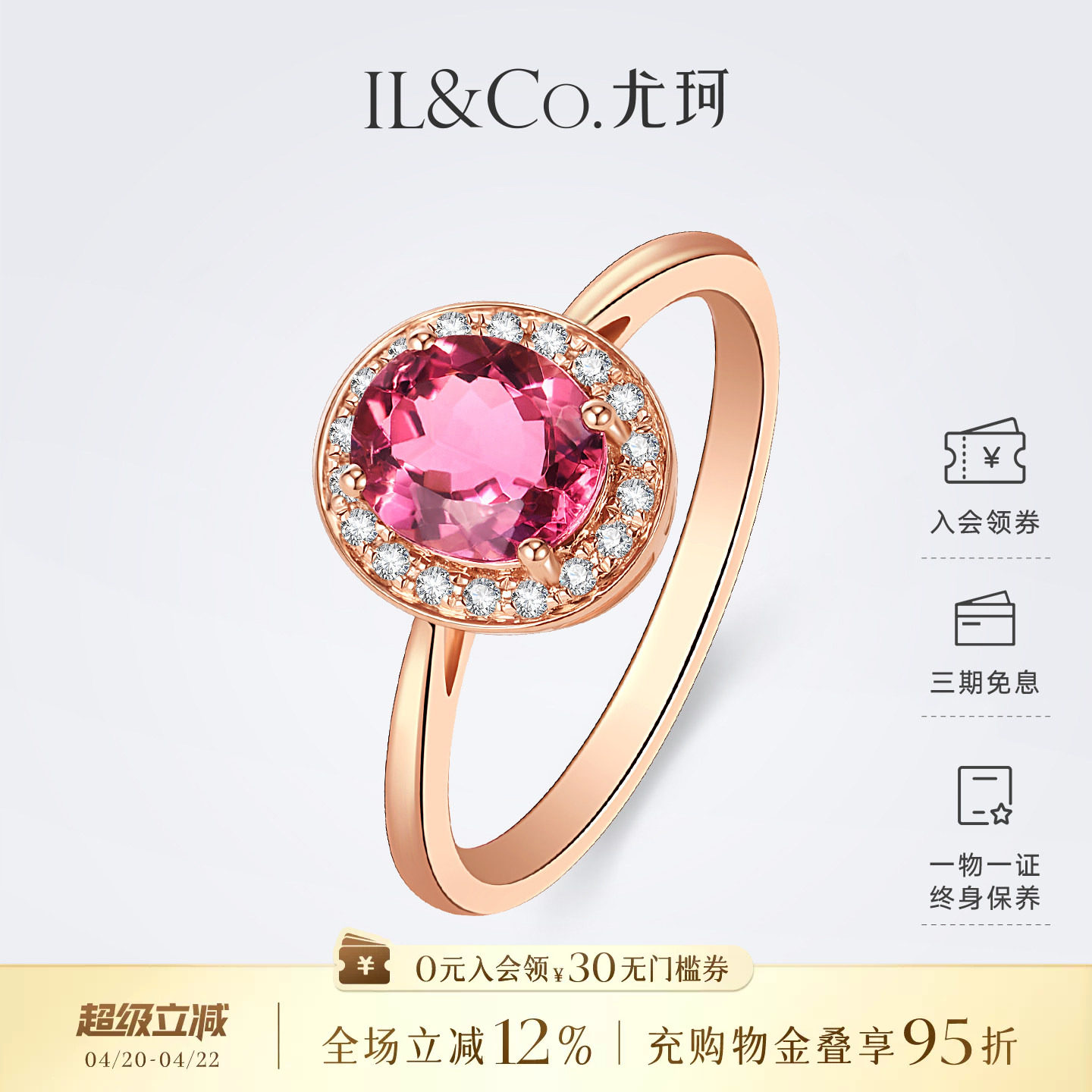 ILCO尤珂 红18K金天然彩色宝石戒指复古钻石镶嵌粉碧玺彩宝女款戒