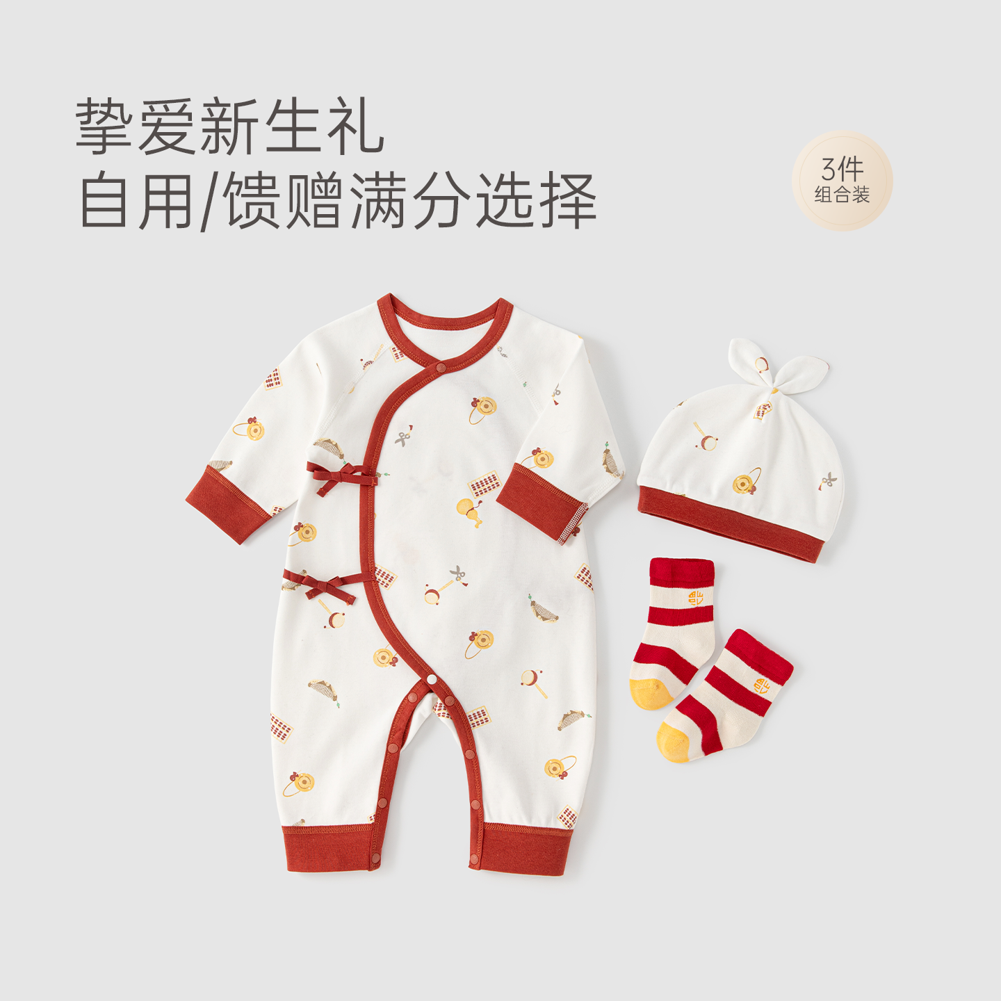 新生儿红色喜庆哈衣春秋季宝宝连体衣新年服婴儿 百天满月服3件装