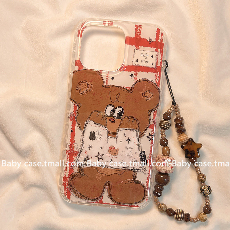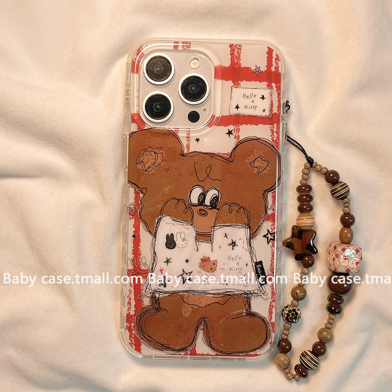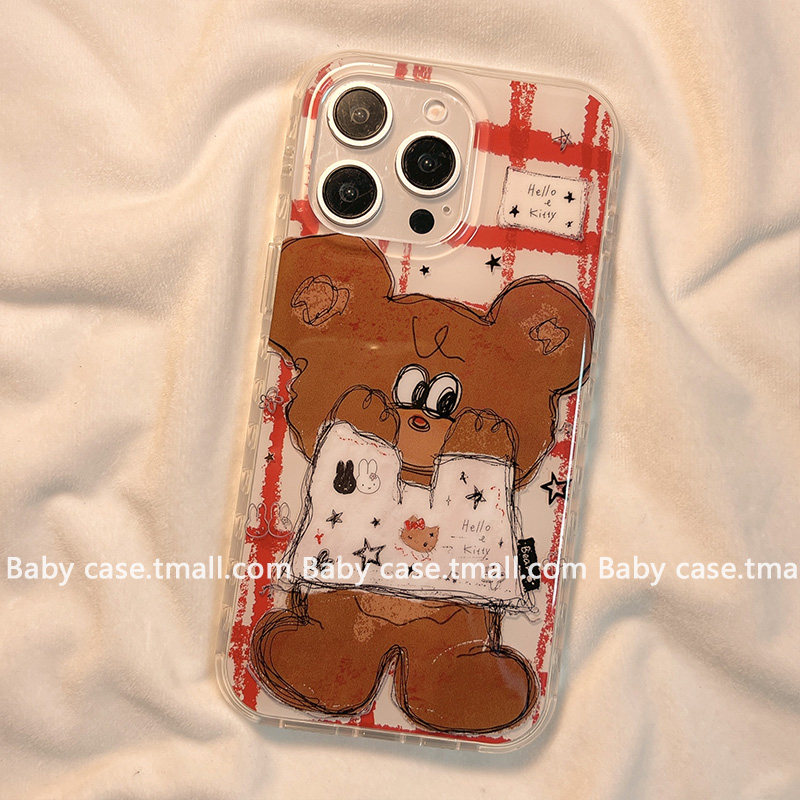 日韩涂鸦红色格纹可爱棕熊适用苹果手机壳